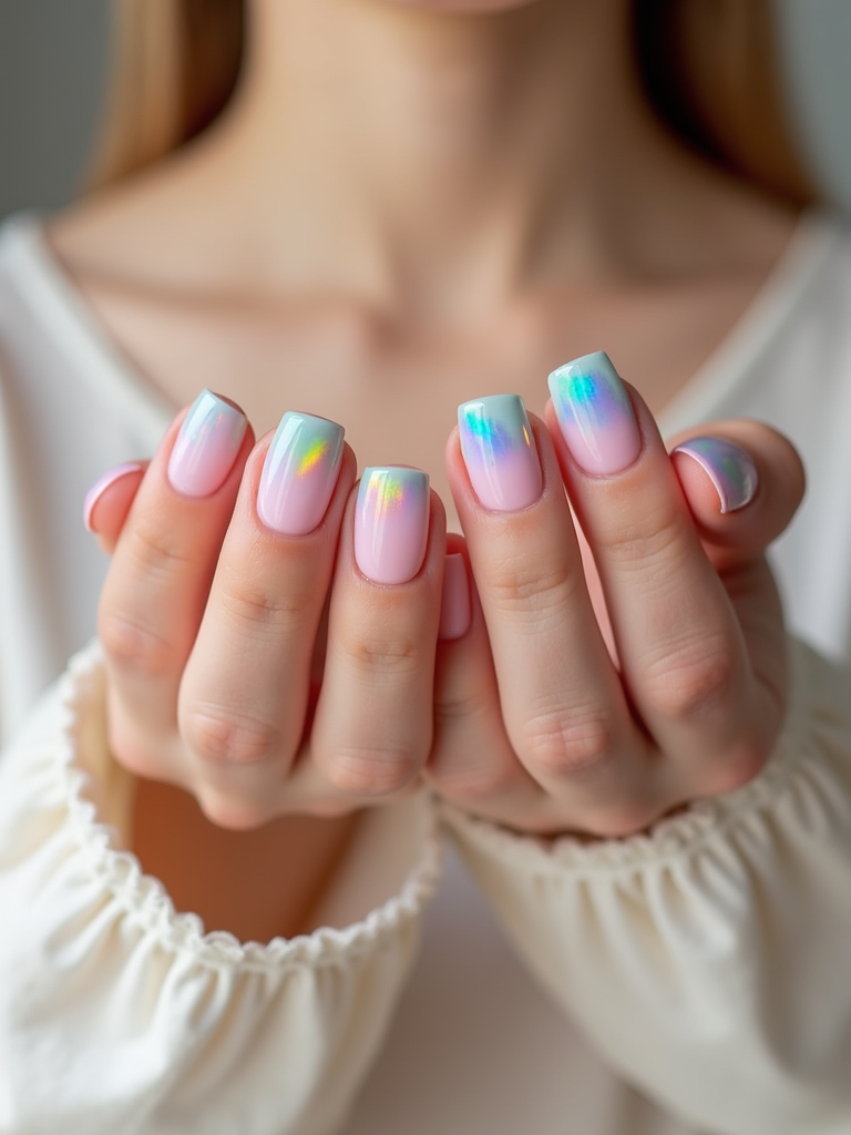 close-up photo of pastel rainbow french tip nails, hands posed gracefully, soft lighting, minimal background, professional beauty photo, high detail, perfect for salon marketing