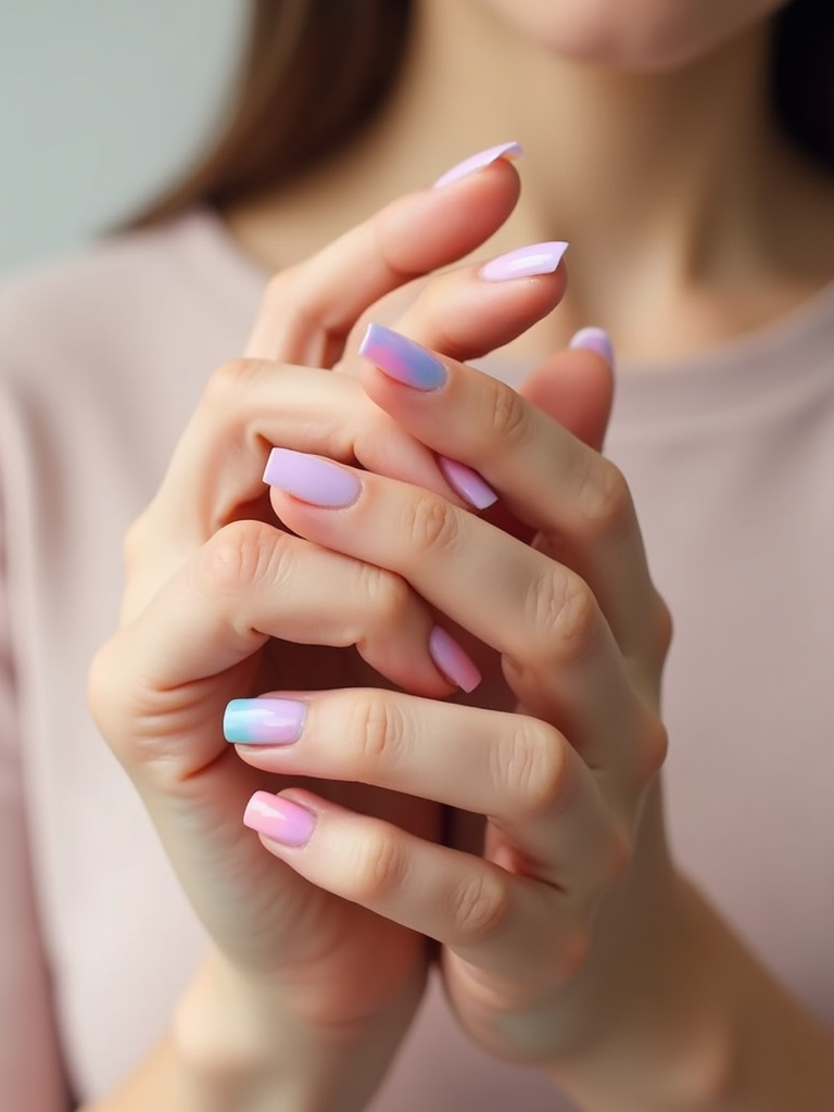 close-up photo of pastel rainbow french tip nails, hands posed gracefully, soft lighting, minimal background, professional beauty photo, high detail, perfect for salon marketing