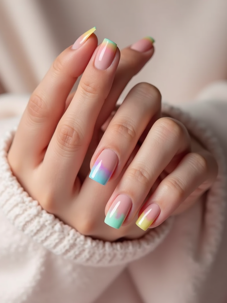 close-up photo of pastel rainbow french tip nails, hands posed gracefully, soft lighting, minimal background, professional beauty photo, high detail, perfect for salon marketing