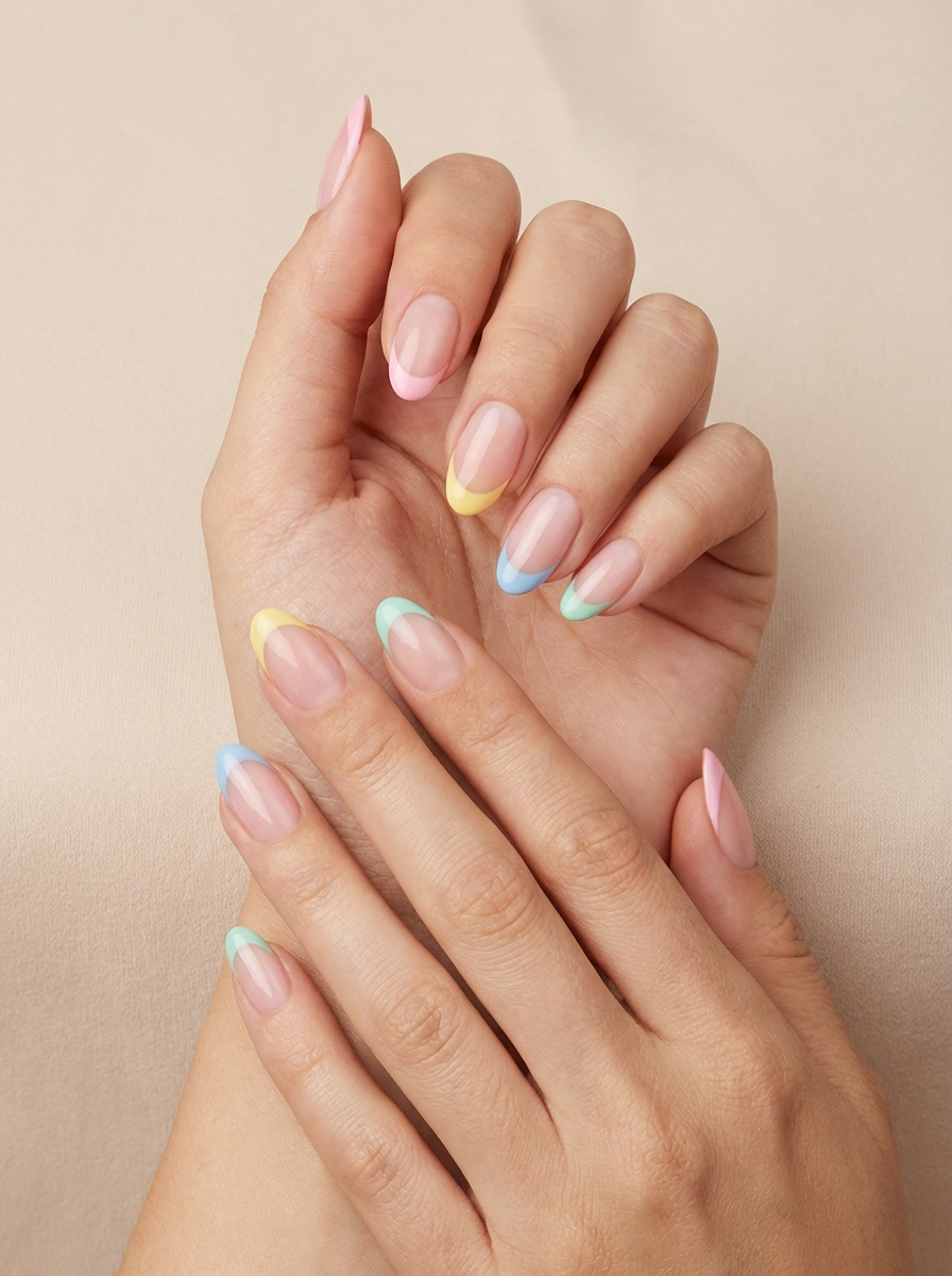 close-up photo of pastel rainbow french tip nails, hands posed gracefully, soft lighting, minimal background, professional beauty photo, high detail, perfect for salon marketing