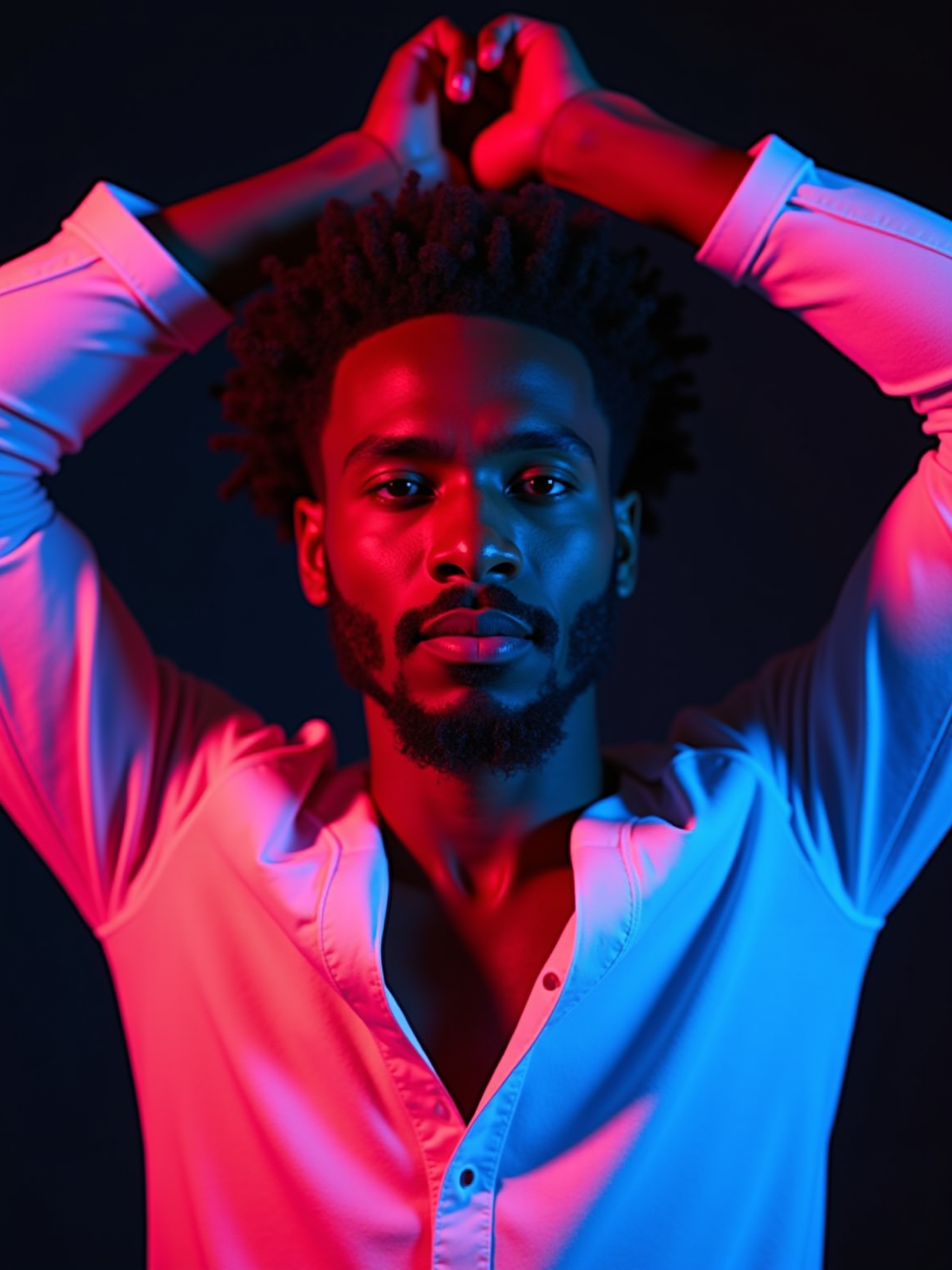 Close-up portrait of a confident model with arms raised above their head, wearing a white outfit. The lighting is bold and vibrant, with strong magenta, orange, and electric blue tones casting dramatic highlights and shadows across their face and arms. Studio background is dark and minimal, emphasizing the neon glow on the skin and hair