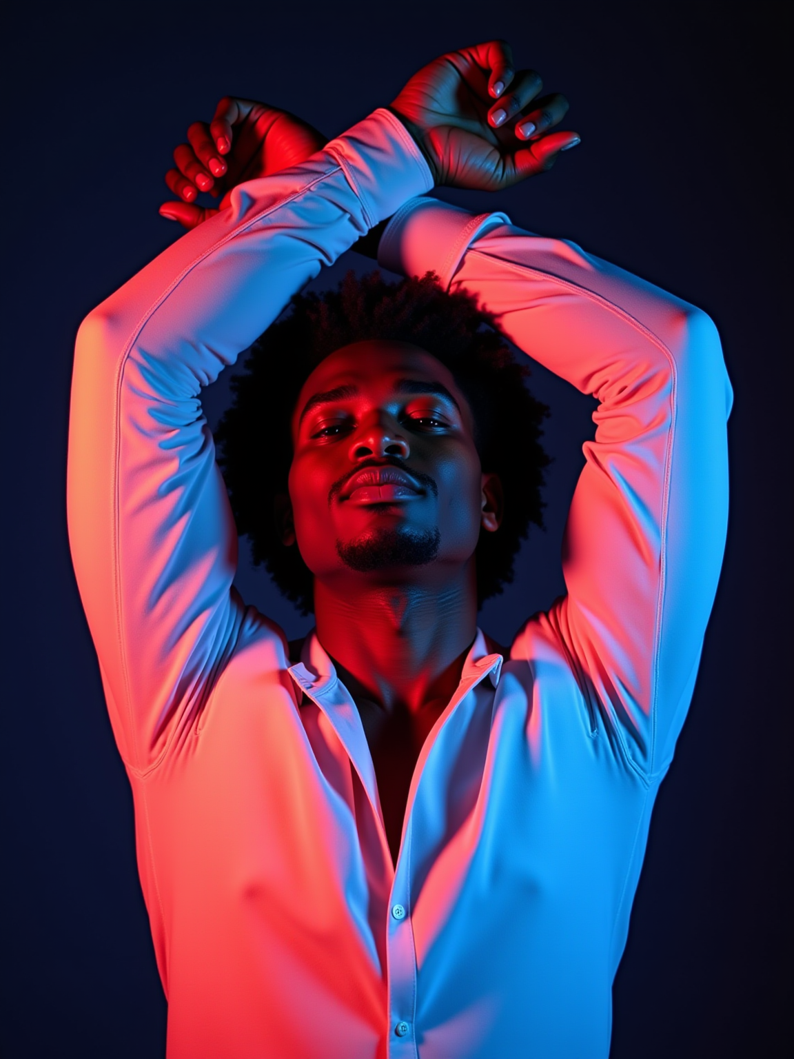 Close-up portrait of a confident model with arms raised above their head, wearing a white outfit. The lighting is bold and vibrant, with strong magenta, orange, and electric blue tones casting dramatic highlights and shadows across their face and arms. Studio background is dark and minimal, emphasizing the neon glow on the skin and hair