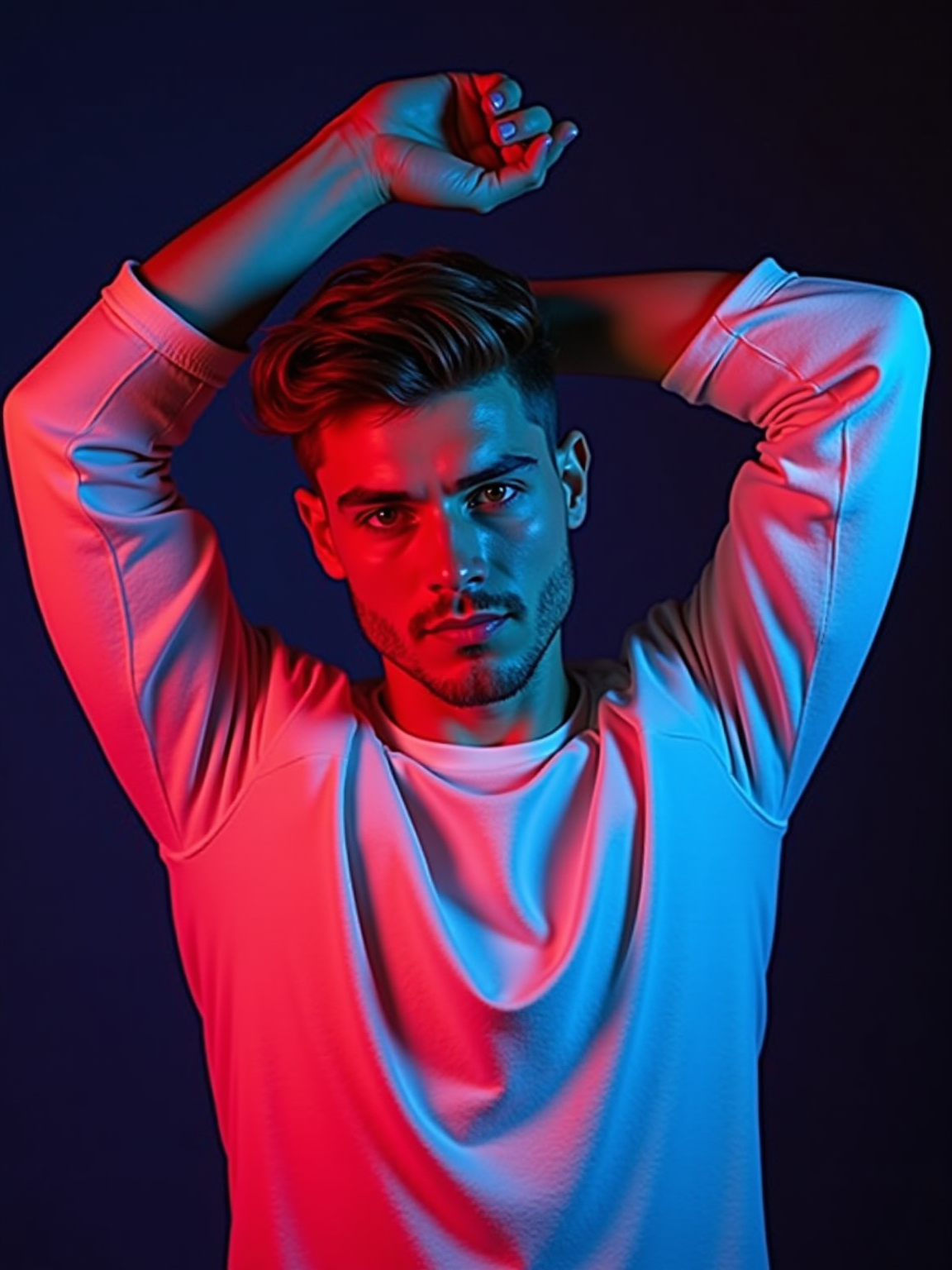 Close-up portrait of a confident model with arms raised above their head, wearing a white outfit. The lighting is bold and vibrant, with strong magenta, orange, and electric blue tones casting dramatic highlights and shadows across their face and arms. Studio background is dark and minimal, emphasizing the neon glow on the skin and hair
