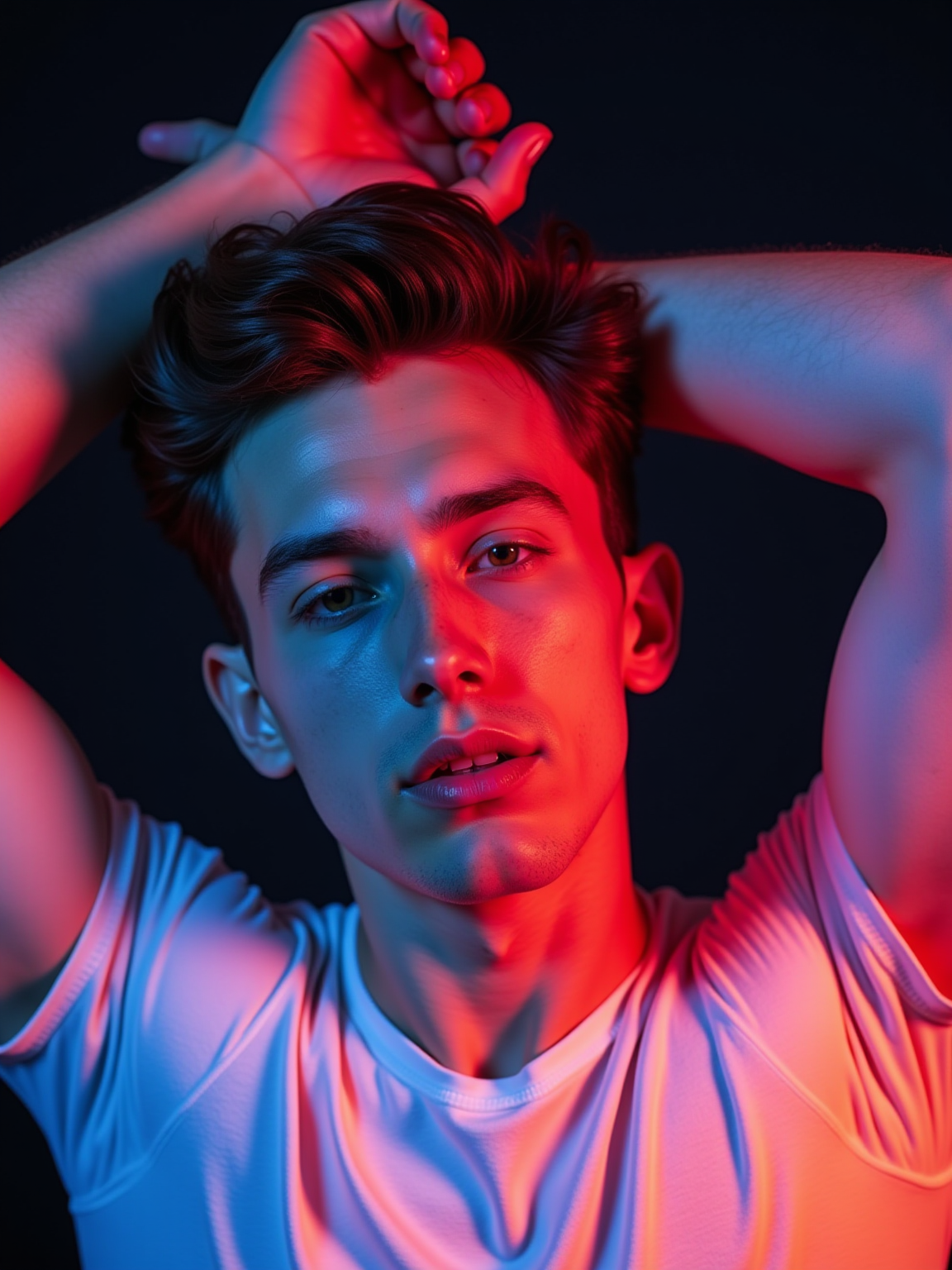 Close-up portrait of a confident model with arms raised above their head, wearing a white outfit. The lighting is bold and vibrant, with strong magenta, orange, and electric blue tones casting dramatic highlights and shadows across their face and arms. Studio background is dark and minimal, emphasizing the neon glow on the skin and hair