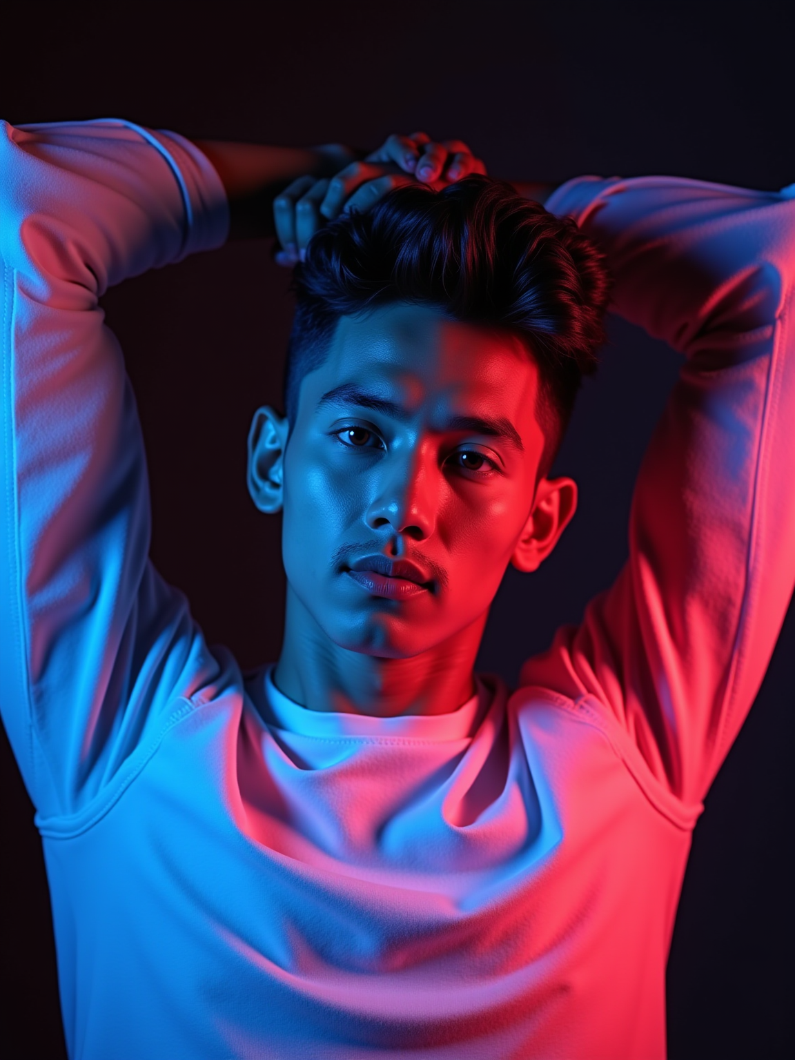 Related photosClose-up portrait of a confident man with arms raised above their head, wearing a white outfit. The lighting is bold and vibrant, with strong magenta, orange, and electric blue tones casting dramatic highlights and shadows across their face and arms. Studio background is dark and minimal, emphasizing the neon glow on the skin and hairClose-up portrait of a confident man with arms raised above their head, wearing a white outfit. The lighting is bold and vibrant, with strong magenta, orange, and electric blue tones casting dramatic highlights and shadows across their face and arms. Studio background is dark and minimal, emphasizing the neon glow on the skin and hairDramatic studio portrait of a confident man, looking over their shoulder. Wearing a form-fitting black outfit. The lighting is intense and cinematic, with strong red and teal color contrast illuminating their hair and skin, casting moody shadows. The background is dark and atmosphericman as with platinum blonde hair and pink latex skirta man in  a tie-dye t-shirt and cargo shorts, embodying the DIY and personalization culture of music festivalsman wearing Y2K aesthetic, 2000s fashion, aughts style, noughties style, grunge or 2000s style, oversized washed out style, baggy pants, low rise pants or cargo pants, crop top, Choker, Metallic, iridescent fabrics, posing for photo