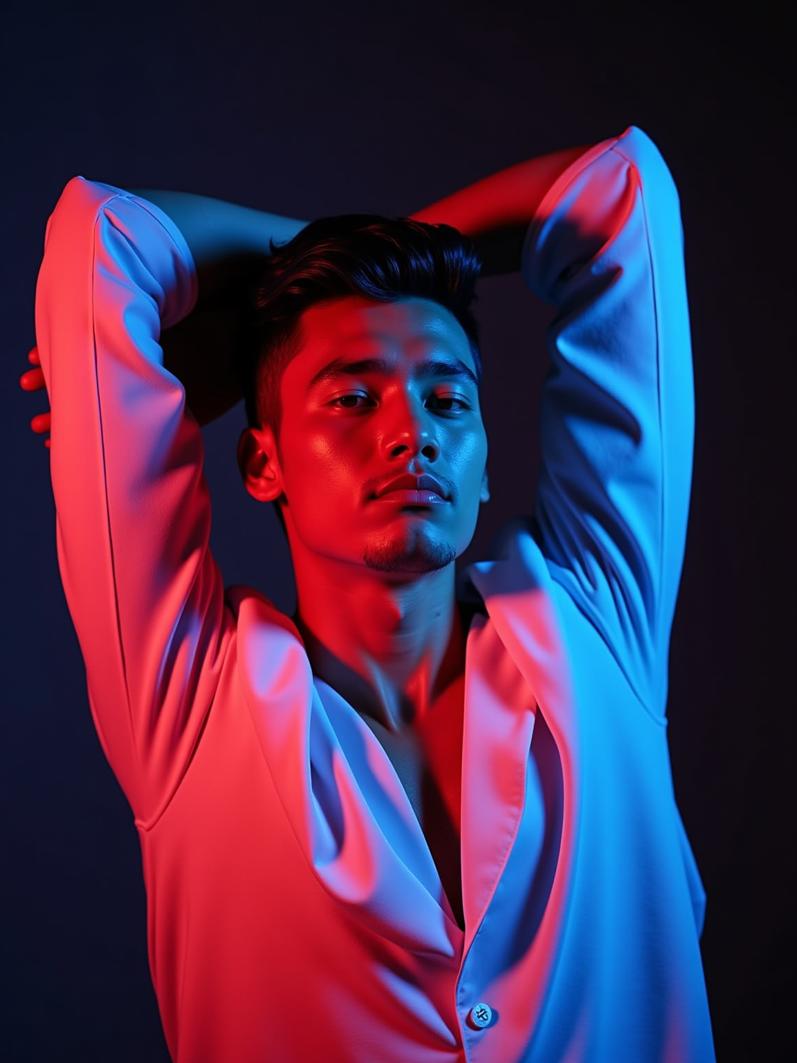 Related photosClose-up portrait of a confident man with arms raised above their head, wearing a white outfit. The lighting is bold and vibrant, with strong magenta, orange, and electric blue tones casting dramatic highlights and shadows across their face and arms. Studio background is dark and minimal, emphasizing the neon glow on the skin and hairClose-up portrait of a confident man with arms raised above their head, wearing a white outfit. The lighting is bold and vibrant, with strong magenta, orange, and electric blue tones casting dramatic highlights and shadows across their face and arms. Studio background is dark and minimal, emphasizing the neon glow on the skin and hairDramatic studio portrait of a confident man, looking over their shoulder. Wearing a form-fitting black outfit. The lighting is intense and cinematic, with strong red and teal color contrast illuminating their hair and skin, casting moody shadows. The background is dark and atmosphericwoman in  sexy lingerie  as a stripper in strip club. wide shot. cinematic lightingwoman as game of thrones characterstylish and chic  woman in Rio de Janeiro wearing a trendy swimsuit and sarong, Copacabana Beach in the background