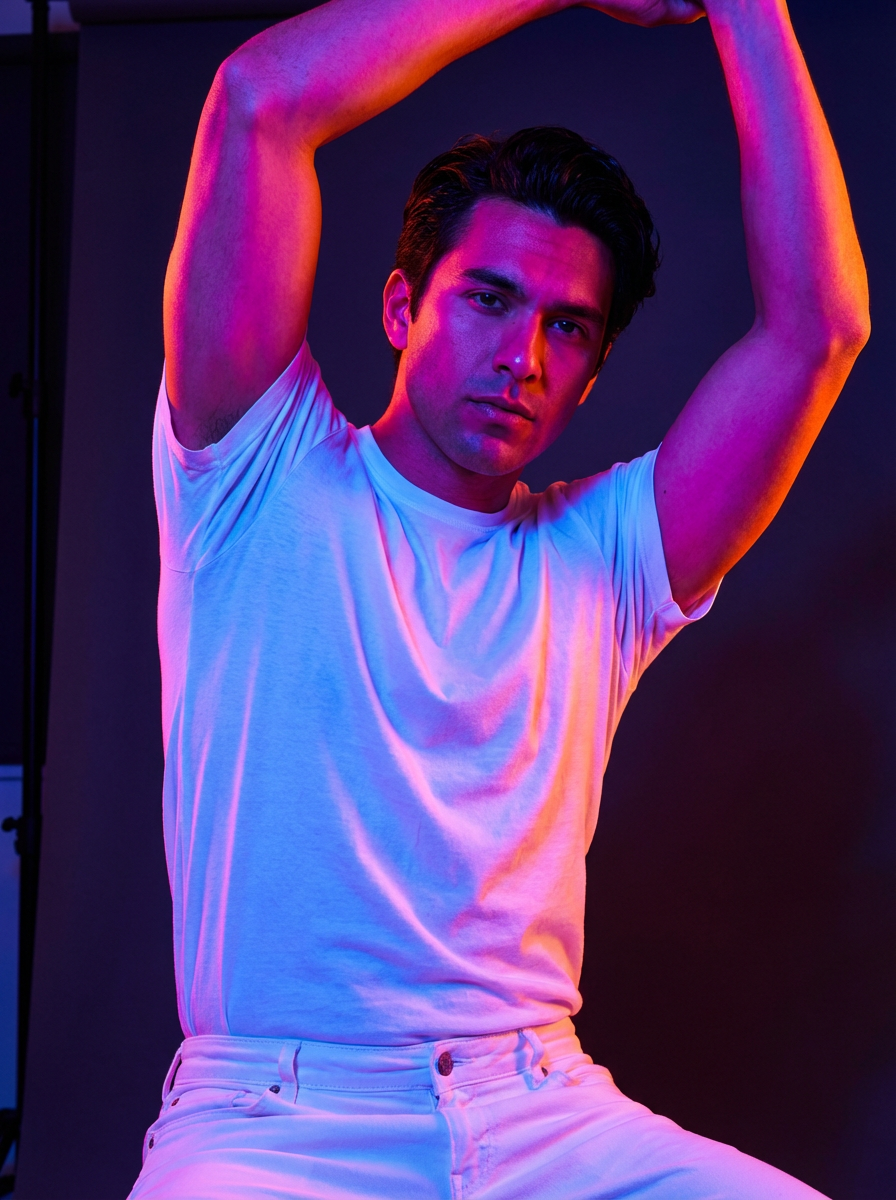 Close-up portrait of a confident model with arms raised above their head, wearing a white outfit. The lighting is bold and vibrant, with strong magenta, orange, and electric blue tones casting dramatic highlights and shadows across their face and arms. Studio background is dark and minimal, emphasizing the neon glow on the skin and hair