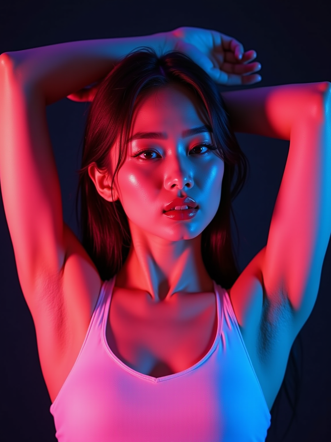 Close-up portrait of a confident model with arms raised above their head, wearing a white outfit. The lighting is bold and vibrant, with strong magenta, orange, and electric blue tones casting dramatic highlights and shadows across their face and arms. Studio background is dark and minimal, emphasizing the neon glow on the skin and hair