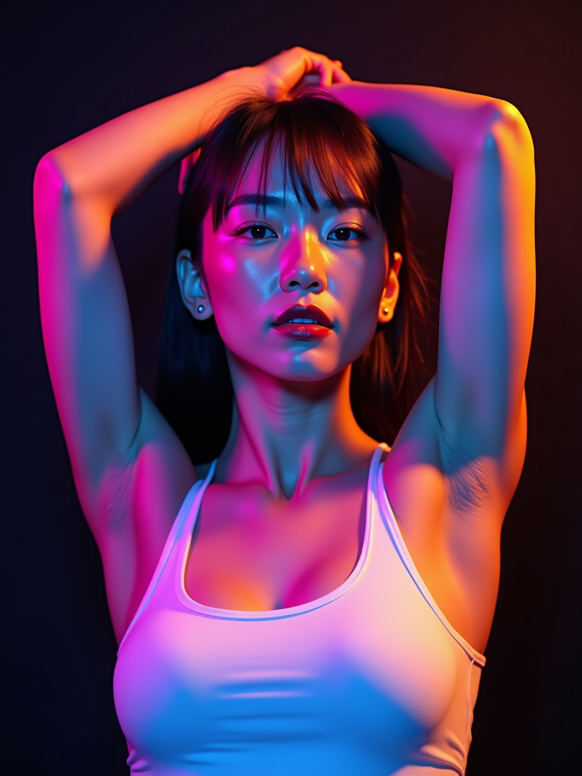 Close-up portrait of a confident model with arms raised above their head, wearing a white outfit. The lighting is bold and vibrant, with strong magenta, orange, and electric blue tones casting dramatic highlights and shadows across their face and arms. Studio background is dark and minimal, emphasizing the neon glow on the skin and hair