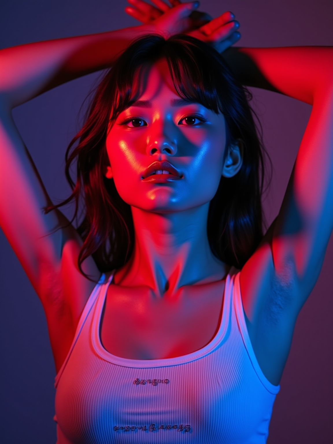 Close-up portrait of a confident model with arms raised above their head, wearing a white outfit. The lighting is bold and vibrant, with strong magenta, orange, and electric blue tones casting dramatic highlights and shadows across their face and arms. Studio background is dark and minimal, emphasizing the neon glow on the skin and hair