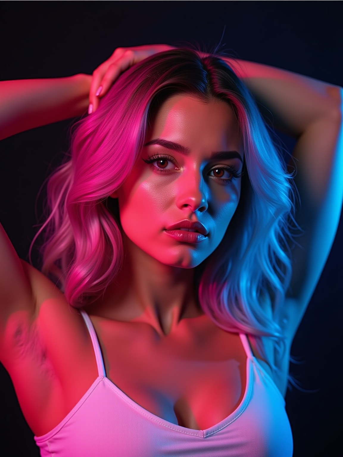 Close-up portrait of a confident model with arms raised above their head, wearing a white outfit. The lighting is bold and vibrant, with strong magenta, orange, and electric blue tones casting dramatic highlights and shadows across their face and arms. Studio background is dark and minimal, emphasizing the neon glow on the skin and hair
