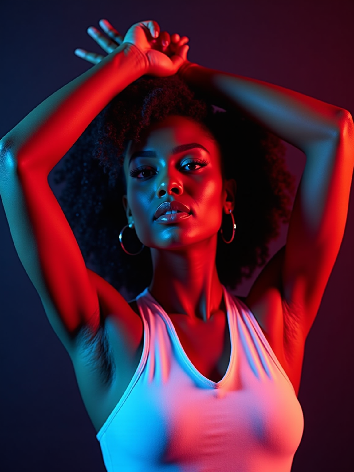 Close-up portrait of a confident model with arms raised above their head, wearing a white outfit. The lighting is bold and vibrant, with strong magenta, orange, and electric blue tones casting dramatic highlights and shadows across their face and arms. Studio background is dark and minimal, emphasizing the neon glow on the skin and hair