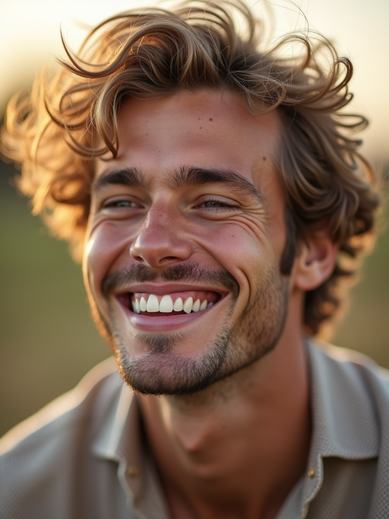 close-up portrait of model, genuine laugh, outdoor setting (golden hour), soft focus, wearing favorite casual outfit, friendly vibe