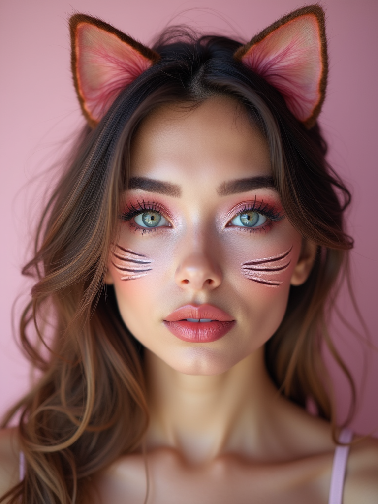 Close-up portrait of model as a Catgirl with soft makeup. Cat ears, whisker face paint, glossy lips, big expressive eyes . Pastel colored background.