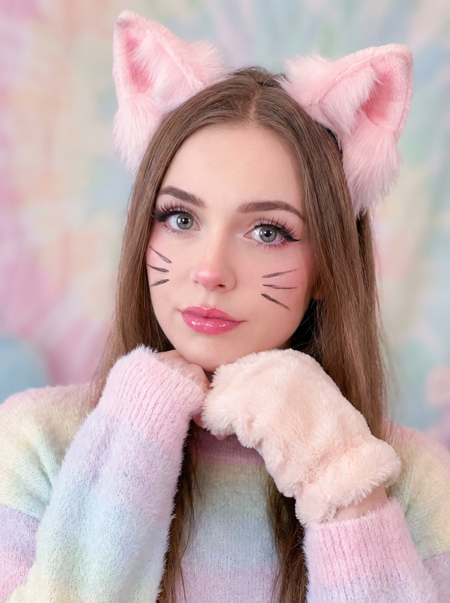 Close-up portrait of model as a Catgirl with soft makeup. Cat ears, whisker face paint, glossy lips, big expressive eyes . Pastel colored background.