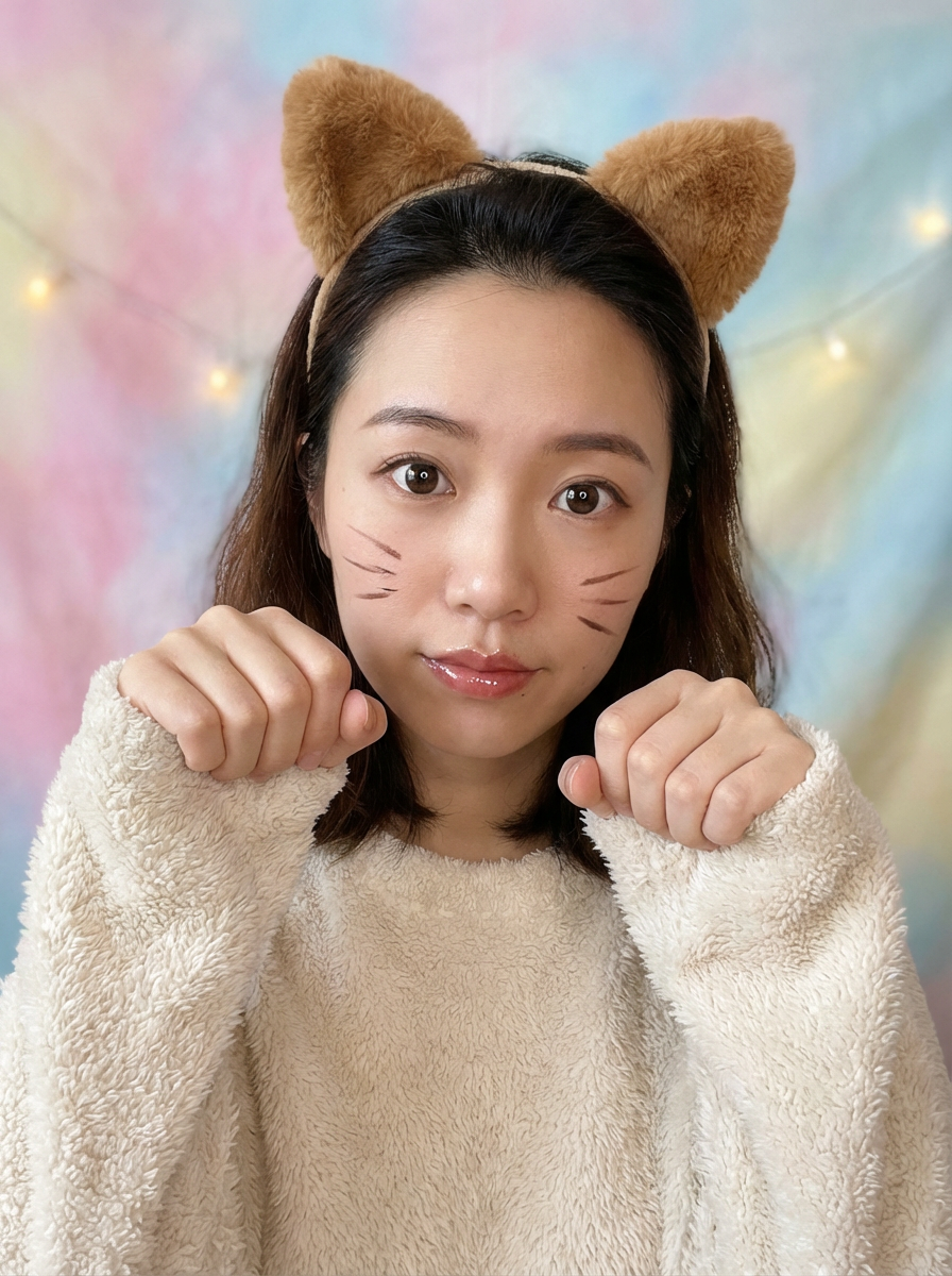 Close-up portrait of model as a Catgirl with soft makeup. Cat ears, whisker face paint, glossy lips, big expressive eyes . Pastel colored background.