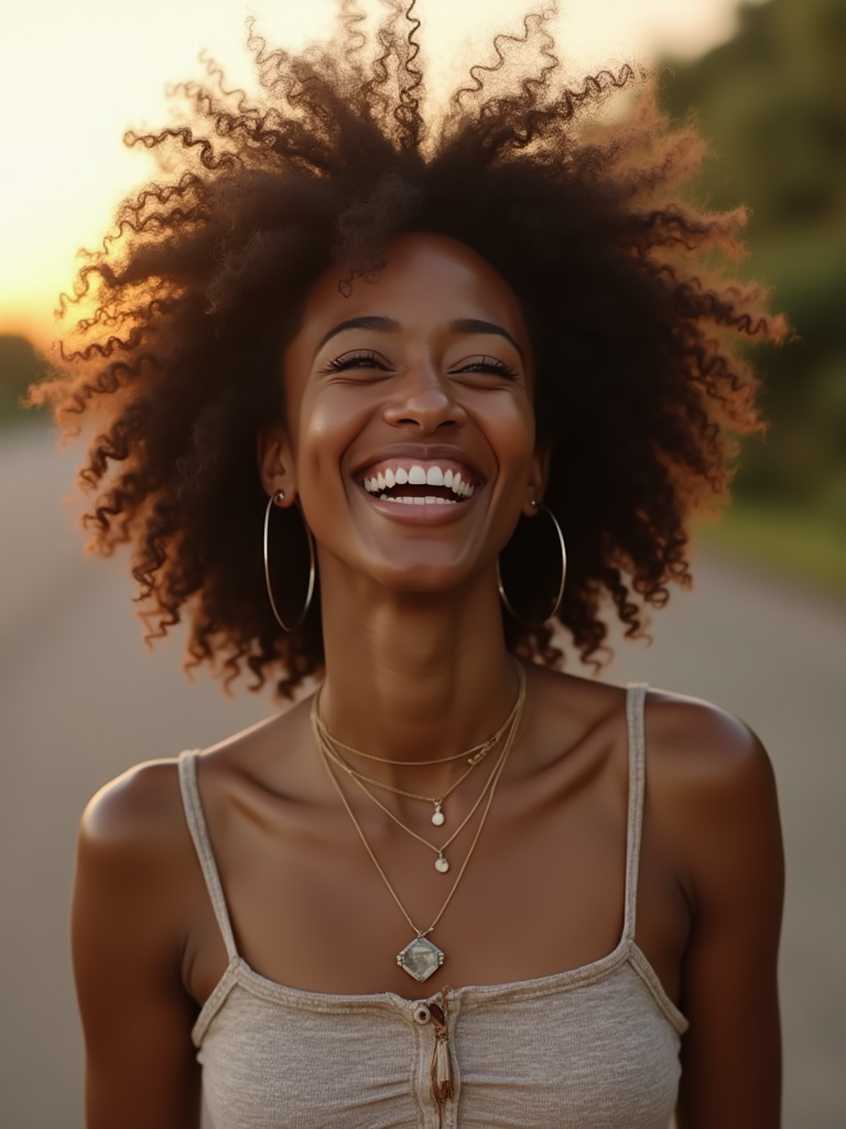 close-up portrait of model, genuine laugh, outdoor setting (golden hour), soft focus, wearing favorite casual outfit, friendly vibe