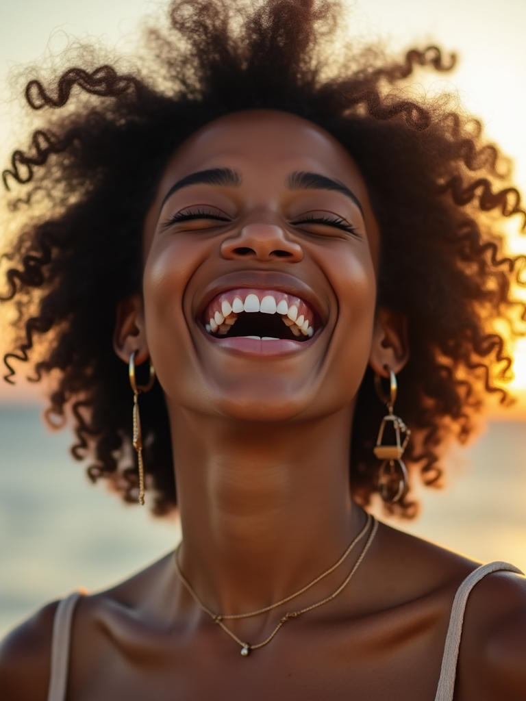 close-up portrait of model, genuine laugh, outdoor setting (golden hour), soft focus, wearing favorite casual outfit, friendly vibe