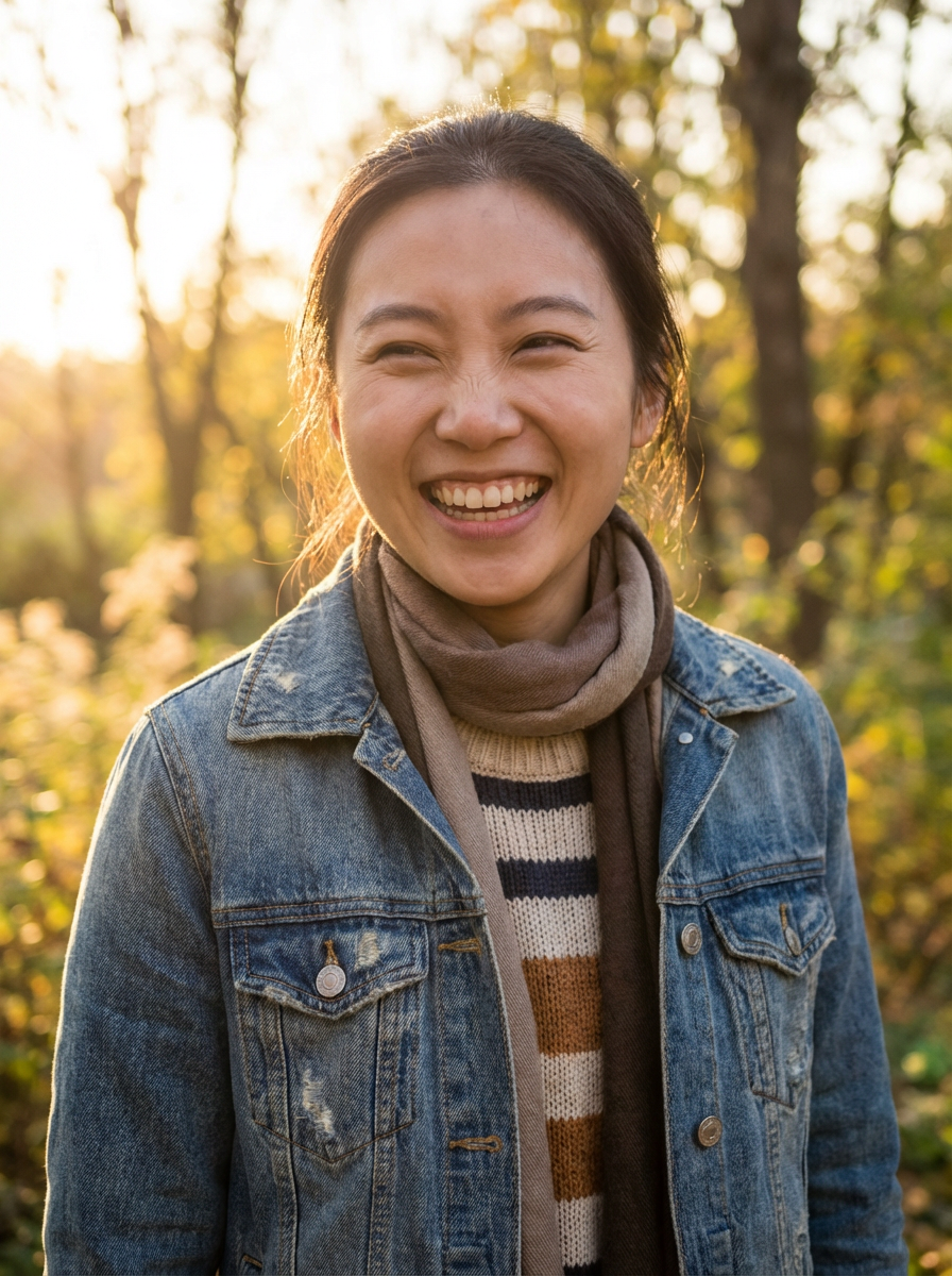 close-up portrait of model, genuine laugh, outdoor setting (golden hour), soft focus, wearing favorite casual outfit, friendly vibe