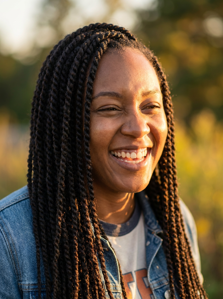 close-up portrait of model, genuine laugh, outdoor setting (golden hour), soft focus, wearing favorite casual outfit, friendly vibe
