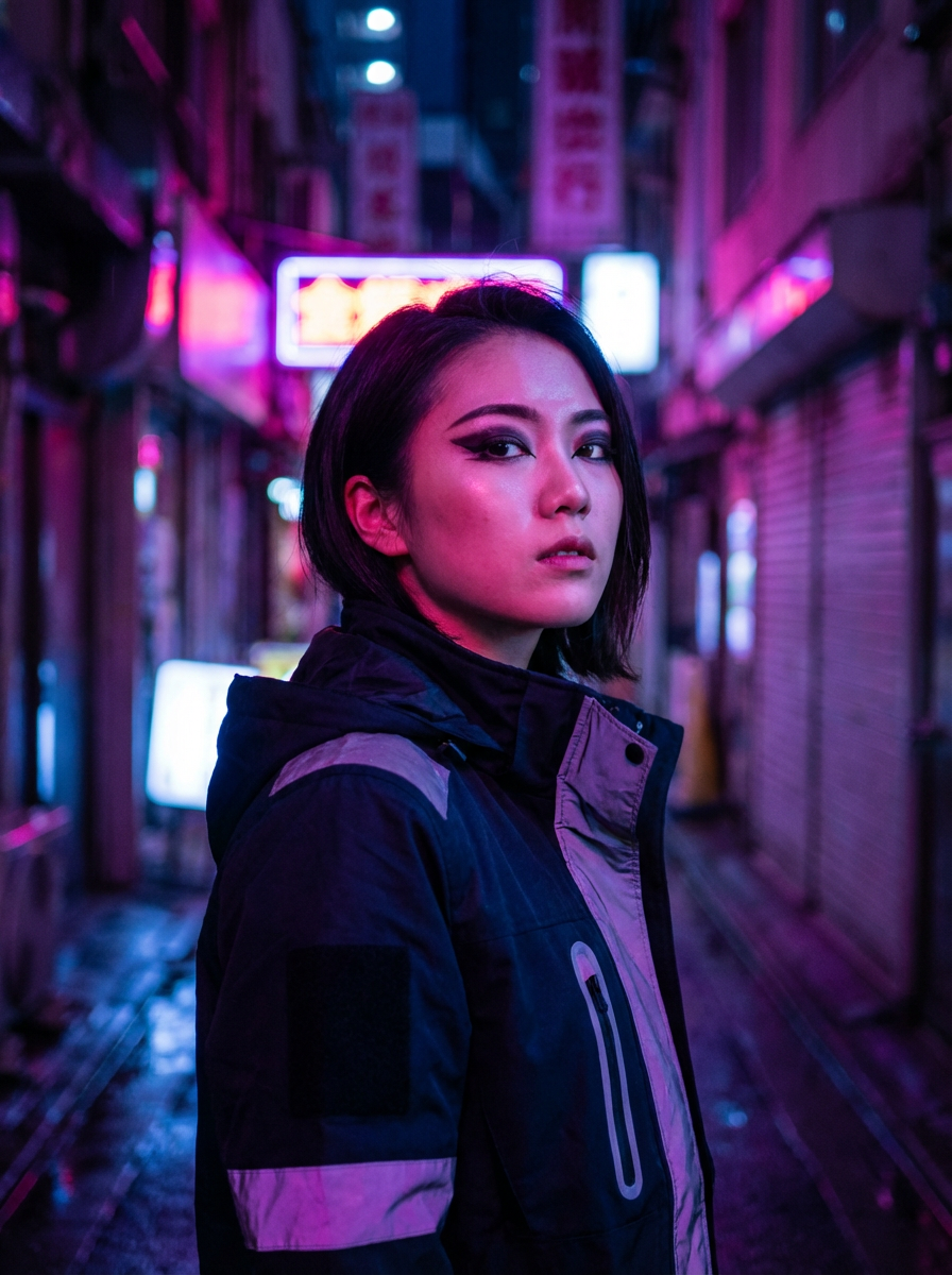 Close-up portrait of model under glowing neon signs. Pink and purple lighting, high-contrast makeup . Sci-fi inspired photography.