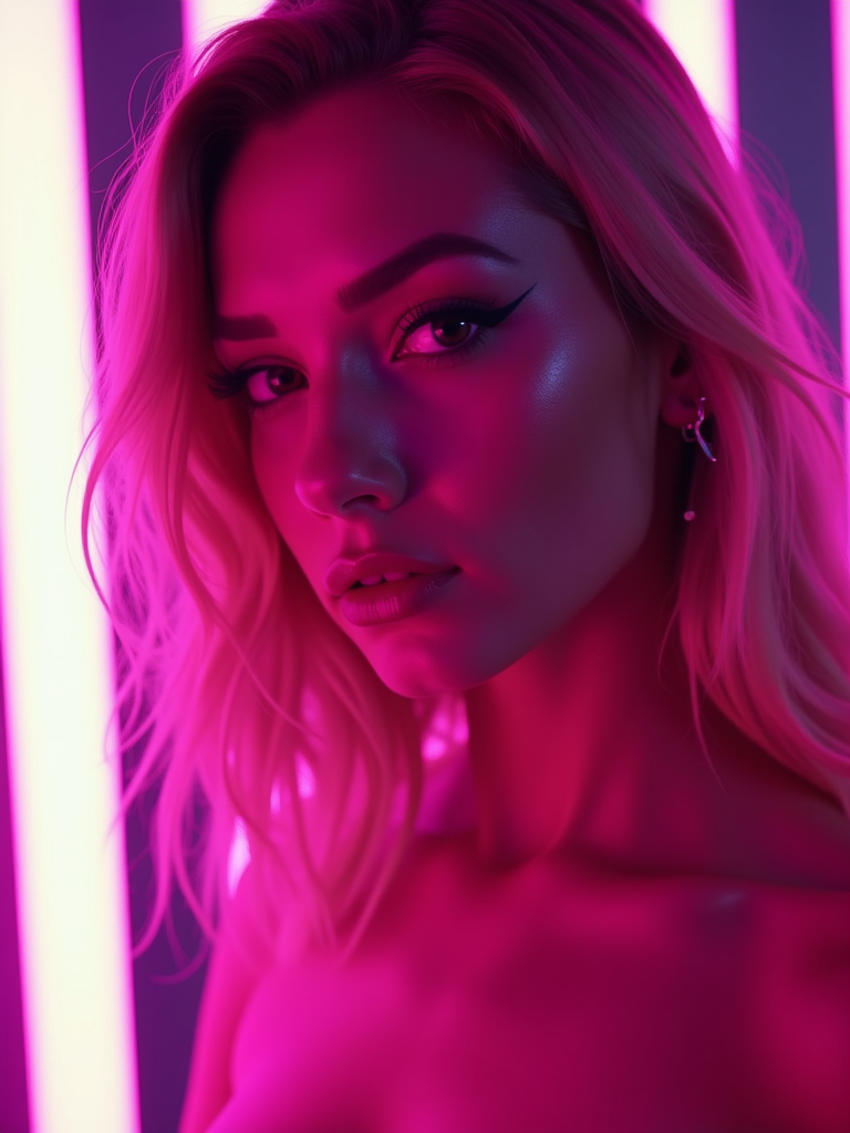 Close-up portrait under glowing neon signs. Pink and purple lighting, high-contrast makeup . Sci-fi inspired photography.