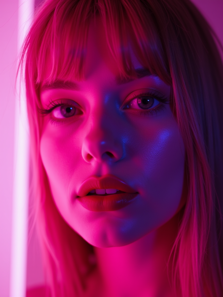 Close-up portrait under glowing neon signs. Pink and purple lighting, high-contrast makeup . Sci-fi inspired photography.