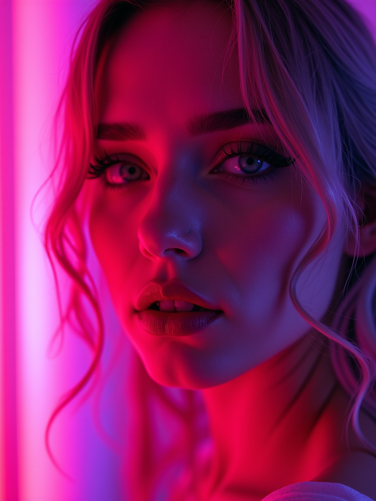 Close-up portrait under glowing neon signs. Pink and purple lighting, high-contrast makeup . Sci-fi inspired photography.