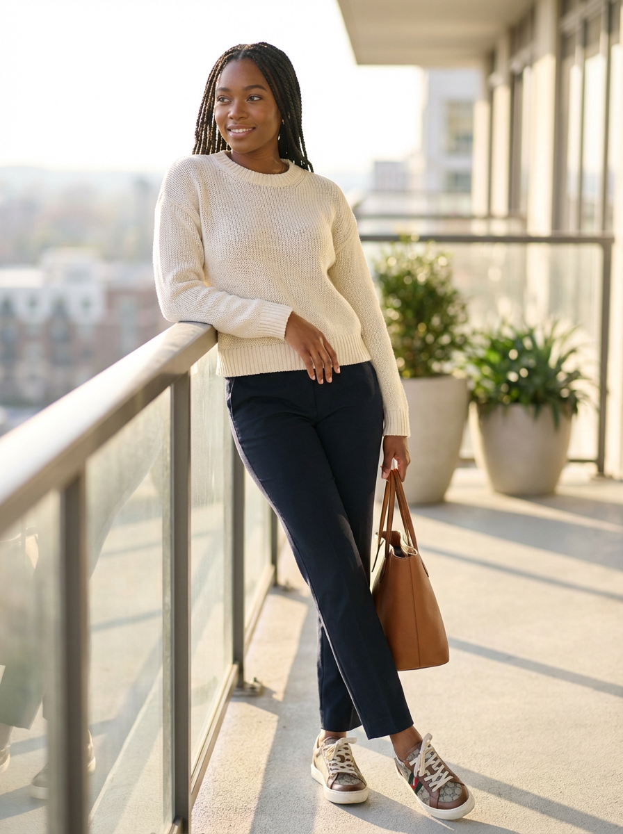Commercial insanely beautiful model in a lifestyle setting. Wearing casual luxury brand clothing, natural pose . Natural lighting, commercial photography style.