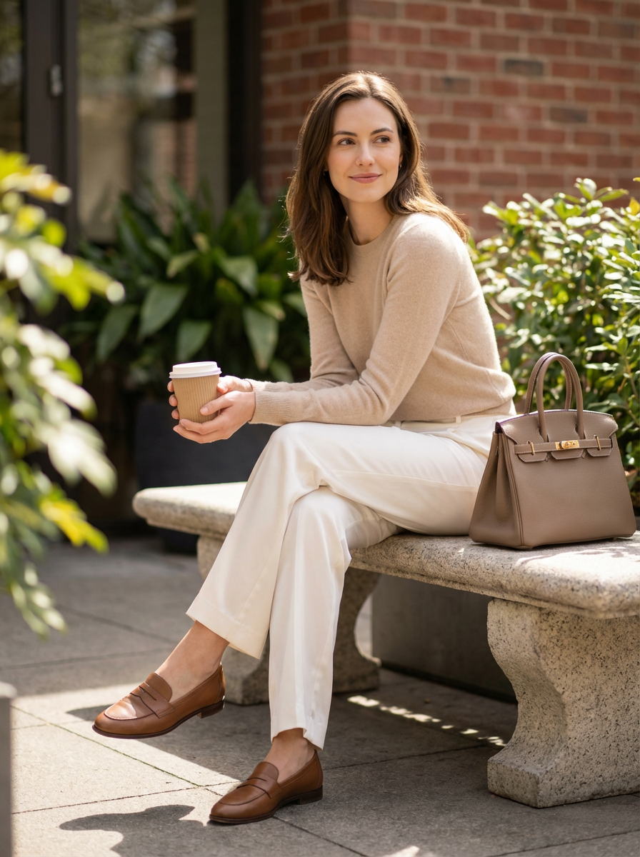 Commercial insanely beautiful model in a lifestyle setting. Wearing casual luxury brand clothing, natural pose . Natural lighting, commercial photography style.