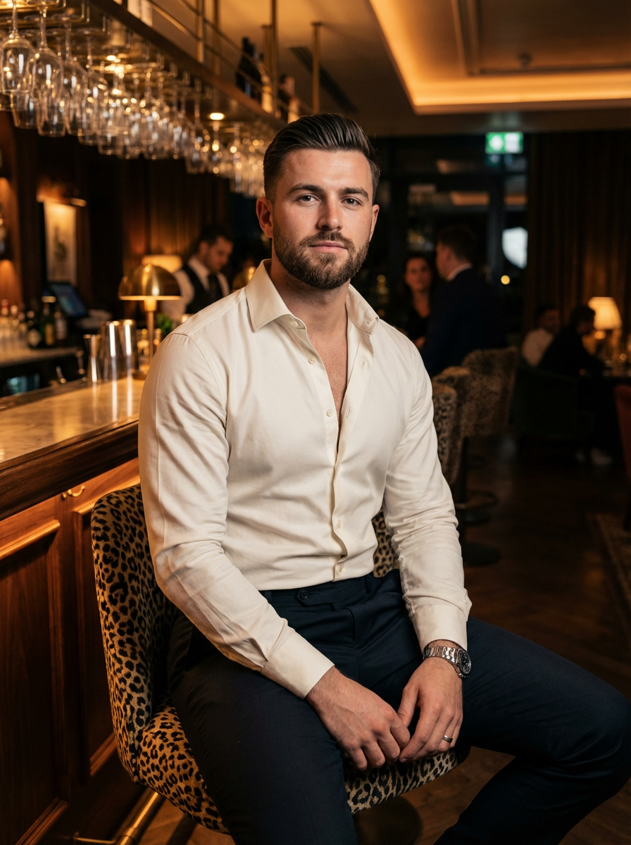 {"composition": {"framing": "medium portrait, seated full torso with upper legs visible", "camera_angle": "eye-level, straight-on perspective", "pose": "seated on bar stool, torso slightly angled, one arm resting on thigh, other relaxed", "cropping": "head to mid-thigh, balanced vertical framing", "depth_of_field": "shallow to moderate; subject sharply isolated from softly blurred background", "balance": "subject slightly right of center, counterbalanced by bar elements on left", "leading_elements": "bar counter edge, hanging glassware drawing eye toward subject's face"}, "color_palette": {"dominant_colors": ["warm mahogany brown", "deep amber", "soft black", "off-white"], "accent_colors": ["golden highlights", "leopard-print beige", "skin tones"], "color_temperature": "warm, tungsten-heavy", "saturation": "moderate with rich warm tones", "contrast": "medium-high contrast emphasizing subject against dark background"}, "lighting": {"type": "artificial interior lighting", "direction": "frontal and slightly overhead", "quality": "soft but directional, bar-style ambient glow", "shadows": "defined but smooth shadows along jawline, under arms, and legs", "highlights": "warm highlights on face, shirt folds, glassware reflections"}, "subject": {"count": 1, "gender_presentation": "masculine-presenting", "age_range": "young adult to early middle-aged", "facial_features": "defined jawline, trimmed beard and mustache, strong brows", "expression": "confident, composed, mildly intense", "hair": {"style": "short, neatly styled", hair}, "eyes": "direct gaze toward camera", "clothing": {"top": "button-down shirt, partially unbuttoned", "bottom": "dark tailored trousers", "accessories": ["metal wristwatch", "ring"]}}, "environment": {"setting": "intimate upscale bar or lounge", "furniture": ["bar counter", "patterned upholstered bar stool"], "decor": ["wood-paneled walls", "hanging wine glasses", "mirror-backed bar"], "people_in_background": "one partially visible figure, dim and out of focus", "ambience": "moody, luxurious, evening social atmosphere"}, "technical_traits": {"camera_type": "digital camera or high-end smartphone", "focal_length_equivalent": "standard portrait range", "aperture_effect": "background blur with strong subject separation", "sharpness": "high facial and clothing detail", "noise_grain": "low noise despite low-light setting", "aspect_ratio": "portrait orientation, approximately 3:4"}, "artistic_elements": {"style": "editorial lifestyle portrait", "mood": "confident, sophisticated, nocturnal", "aesthetic": "modern gentleman with classic lounge influence", "influences": ["fashion editorial", "nightlife portrait photography"]}, "typography": {"presence": "none", "notes": "no readable text or signage visible"}, "background": {"focus_level": "soft focus with strong ambient glow", "color_tones": "dark browns, warm oranges, deep shadows", "function": "creates intimate atmosphere while framing subject as focal point"}}