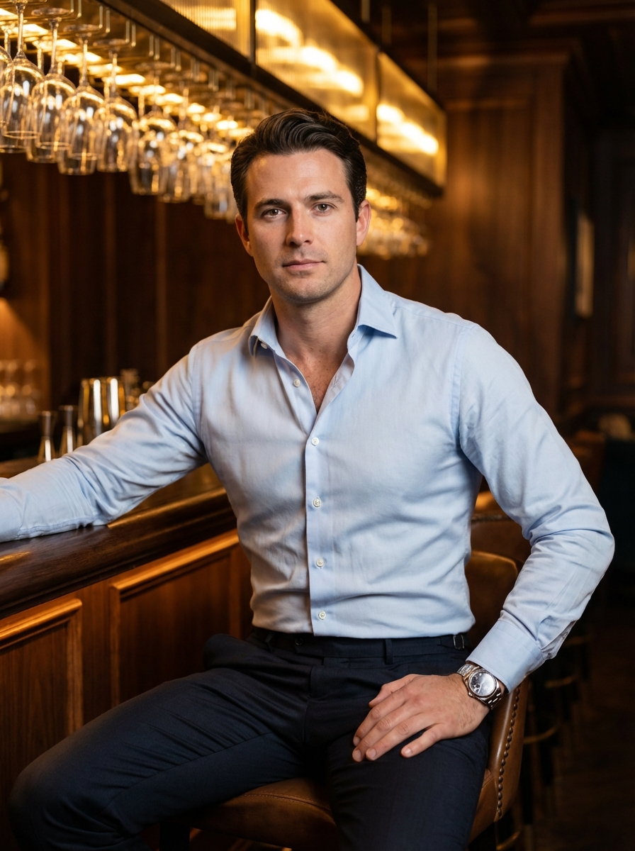 {"composition": {"framing": "medium portrait, seated full torso with upper legs visible", "camera_angle": "eye-level, straight-on perspective", "pose": "seated on bar stool, torso slightly angled, one arm resting on thigh, other relaxed", "cropping": "head to mid-thigh, balanced vertical framing", "depth_of_field": "shallow to moderate; subject sharply isolated from softly blurred background", "balance": "subject slightly right of center, counterbalanced by bar elements on left", "leading_elements": "bar counter edge, hanging glassware drawing eye toward subject's face"}, "color_palette": {"dominant_colors": ["warm mahogany brown", "deep amber", "soft black", "off-white"], "accent_colors": ["golden highlights", "leopard-print beige", "skin tones"], "color_temperature": "warm, tungsten-heavy", "saturation": "moderate with rich warm tones", "contrast": "medium-high contrast emphasizing subject against dark background"}, "lighting": {"type": "artificial interior lighting", "direction": "frontal and slightly overhead", "quality": "soft but directional, bar-style ambient glow", "shadows": "defined but smooth shadows along jawline, under arms, and legs", "highlights": "warm highlights on face, shirt folds, glassware reflections"}, "subject": {"count": 1, "gender_presentation": "masculine-presenting", "age_range": "young adult to early middle-aged", "facial_features": "defined jawline, trimmed beard and mustache, strong brows", "expression": "confident, composed, mildly intense", "hair": {"style": "short, neatly styled", hair}, "eyes": "direct gaze toward camera", "clothing": {"top": "button-down shirt, partially unbuttoned", "bottom": "dark tailored trousers", "accessories": ["metal wristwatch", "ring"]}}, "environment": {"setting": "intimate upscale bar or lounge", "furniture": ["bar counter", "patterned upholstered bar stool"], "decor": ["wood-paneled walls", "hanging wine glasses", "mirror-backed bar"], "people_in_background": "one partially visible figure, dim and out of focus", "ambience": "moody, luxurious, evening social atmosphere"}, "technical_traits": {"camera_type": "digital camera or high-end smartphone", "focal_length_equivalent": "standard portrait range", "aperture_effect": "background blur with strong subject separation", "sharpness": "high facial and clothing detail", "noise_grain": "low noise despite low-light setting", "aspect_ratio": "portrait orientation, approximately 3:4"}, "artistic_elements": {"style": "editorial lifestyle portrait", "mood": "confident, sophisticated, nocturnal", "aesthetic": "modern gentleman with classic lounge influence", "influences": ["fashion editorial", "nightlife portrait photography"]}, "typography": {"presence": "none", "notes": "no readable text or signage visible"}, "background": {"focus_level": "soft focus with strong ambient glow", "color_tones": "dark browns, warm oranges, deep shadows", "function": "creates intimate atmosphere while framing subject as focal point"}}