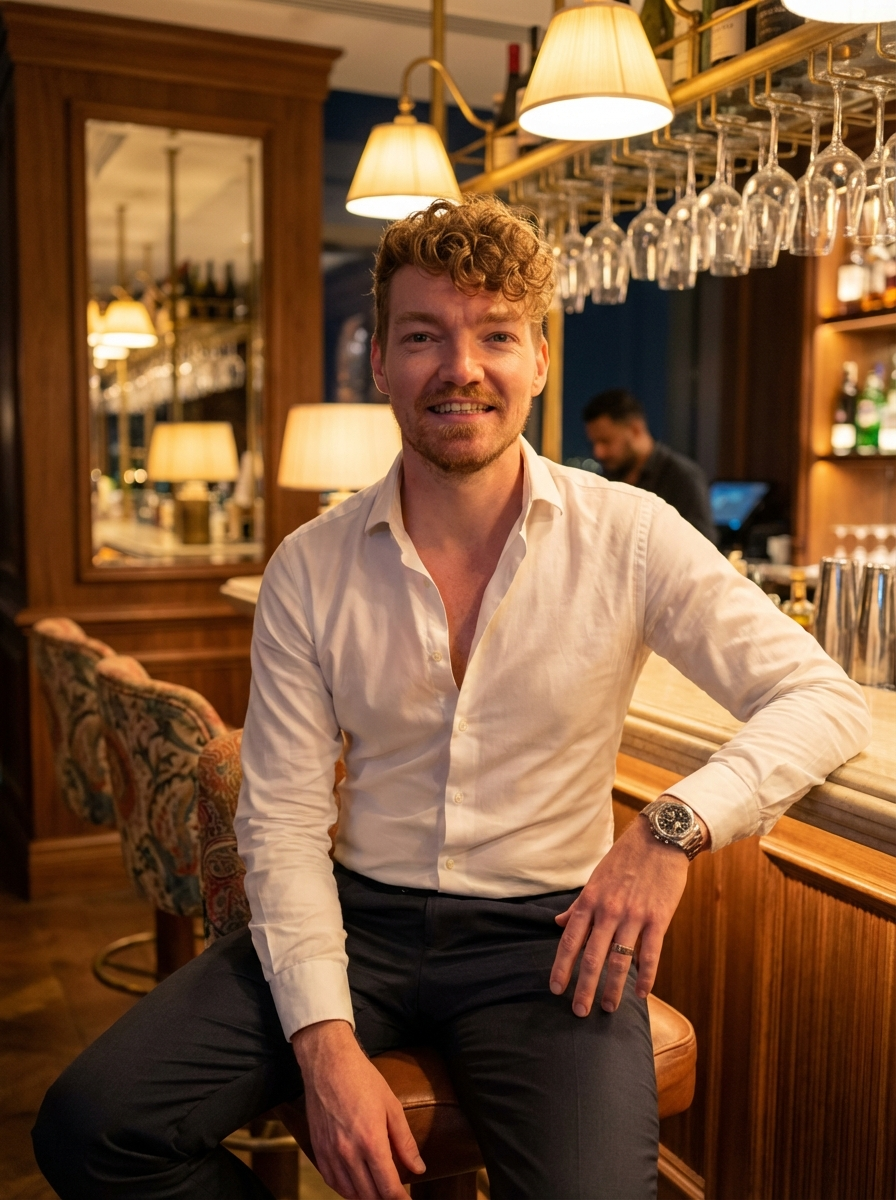 {"composition": {"framing": "medium portrait, seated full torso with upper legs visible", "camera_angle": "eye-level, straight-on perspective", "pose": "seated on bar stool, torso slightly angled, one arm resting on thigh, other relaxed", "cropping": "head to mid-thigh, balanced vertical framing", "depth_of_field": "shallow to moderate; subject sharply isolated from softly blurred background", "balance": "subject slightly right of center, counterbalanced by bar elements on left", "leading_elements": "bar counter edge, hanging glassware drawing eye toward subject's face"}, "color_palette": {"dominant_colors": ["warm mahogany brown", "deep amber", "soft black", "off-white"], "accent_colors": ["golden highlights", " leopard-print pattern", "skin tones"], "color_temperature": "warm, tungsten-heavy", "saturation": "moderate with rich warm tones", "contrast": "medium-high contrast emphasizing subject against dark background"}, "lighting": {"type": "artificial interior lighting", "direction": "frontal and slightly overhead", "quality": "soft but directional, bar-style ambient glow", "shadows": "defined but smooth shadows along jawline, under arms, and legs", "highlights": "warm highlights on face, shirt folds, glassware reflections"}, "subject": {"count": 1, "gender_presentation": " masculine-presenting", "age_range": "young adult to early middle-aged", "facial_features": " defined jawline, trimmed beard and mustache, strong brows", "expression": "confident, composed, mildly intense", "hair": {"style": " short, neatly styled", "color": "dark"}, "eyes": "direct gaze toward camera", "clothing": {"top": " white button-down shirt, partially unbuttoned", "bottom": " dark tailored trousers", "accessories": [" metal wristwatch, ring"]}}, "environment": {"setting": "intimate upscale bar or lounge", "furniture": ["bar counter", "patterned upholstered bar stool"], "decor": ["wood-paneled walls", "hanging wine glasses", "mirror-backed bar"], "people_in_background": "one partially visible figure, dim and out of focus", "ambience": "moody, luxurious, evening social atmosphere"}, "technical_traits": {"camera_type": "digital camera or high-end smartphone", "focal_length_equivalent": "standard portrait range", "aperture_effect": "background blur with strong subject separation", "sharpness": "high facial and clothing detail", "noise_grain": "low noise despite low-light setting", "aspect_ratio": "portrait orientation, approximately 3:4"}, "artistic_elements": {"style": "editorial lifestyle portrait", "mood": "confident, sophisticated, nocturnal", "aesthetic": " modern gentleman with classic lounge influence", "influences": ["fashion editorial", "nightlife portrait photography"]}, "typography": {"presence": "none", "notes": "no readable text or signage visible"}, "background": {"focus_level": "soft focus with strong ambient glow", "color_tones": "dark browns, warm oranges, deep shadows", "function": "creates intimate atmosphere while framing subject as focal point"}}}