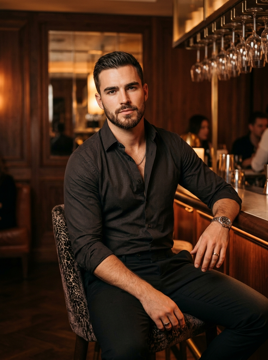 {"composition": {"framing": "medium portrait, seated full with upper legs ", "camera_angle": "eye-level, straight-on perspective", "pose": "seated on bar stool, slightly angled, one arm resting on , other relaxed", "cropping": "head to mid- , balanced vertical framing", "depth_of_field": "shallow to moderate; subject sharply isolated from softly blurred background", "balance": "subject slightly right of center, counterbalanced by bar elements on left", "leading_elements": "bar counter edge, hanging glassware drawing eye toward subject's face"}, "color_palette": {"dominant_colors": ["warm mahogany brown", "deep amber", "soft black", "off-white"], "accent_colors": ["golden highlights", "leopard-print beige", "skin tones"], "color_temperature": "warm, tungsten-heavy", "saturation": "moderate with rich warm tones", "contrast": "medium-high contrast emphasizing subject against dark background"}, "lighting": {"type": "artificial interior lighting", "direction": "frontal and slightly overhead", "quality": "soft but directional, bar-style ambient glow", "shadows": "defined but smooth shadows along jawline, under arms, and legs", "highlights": "warm highlights on face, shirt folds, glassware reflections"}, "subject": {"count": 1, "gender_presentation": "masculine-presenting", "age_range": "young adult to early middle-aged", "facial_features": "defined jawline, trimmed beard and mustache, strong brows", "expression": "confident, composed, mildly intense", "hair": {"style": "short, neatly styled", hair}, "eyes": "direct gaze toward camera", "clothing": {"top": "button-down shirt, partially unbuttoned", "bottom": "dark tailored trousers", "accessories": ["metal wristwatch", "ring"]}}, "environment": {"setting": " upscale bar or lounge", "furniture": ["bar counter", "patterned upholstered bar stool"], "decor": ["wood-paneled walls", "hanging wine glasses", "mirror-backed bar"], "people_in_background": "one partially figure, dim and out of focus", "ambience": "moody, luxurious, evening social atmosphere"}, "technical_traits": {"camera_type": "digital camera or high-end smartphone", "focal_length_equivalent": "standard portrait range", "aperture_effect": "background blur with strong subject separation", "sharpness": "high facial and clothing detail", "noise_grain": "low noise despite low-light setting", "aspect_ratio": "portrait orientation, approximately 3:4"}, "artistic_elements": {"style": "editorial lifestyle portrait", "mood": "confident, sophisticated, nocturnal", "aesthetic": "modern gentleman with classic lounge influence", "influences": ["fashion editorial", "nightlife portrait photography"]}, "typography": {"presence": "none", "notes": "no readable text or signage "}, "background": {"focus_level": "soft focus with strong ambient glow", "color_tones": "dark browns, warm oranges, deep shadows", "function": "creates atmosphere while framing subject as focal point"}}