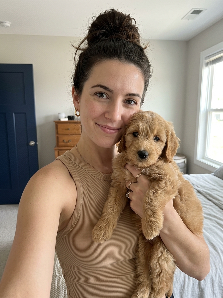 {"composition": {"framing": "Vertical, close-up shot", "camera_angle": "Slightly high angle, looking down", "focus": "Sharp focus on the model and the puppy", "depth_of_field": "Shallow, with the background slightly blurred", "rule_of_thirds": "Subjects are centered in the frame"}, "color_profile": {"palette": "Warm and natural", "dominant_colors": ["Tan", "Black", "White", "Gold"], "accent_colors": ["Navy blue"], "skin_tones": "Warm, tan", "saturation": "Natural", "contrast": "Moderate"}, "lighting": {"source": "Natural daylight", "direction": "From the right side (window)", "quality": "Soft, diffused, flattering", "shadows": "Soft and minimal", "highlights": "Gentle highlights on the model's skin and hair, and the puppy's fur"}, "technical_specs": {"camera": "Smartphone camera (likely iPhone)", "lens": "Wide-angle lens", "aperture": "f/1.8 (estimated)", "shutter_speed": "Auto", "iso": "Auto", "white_balance": "Auto"}, "artistic_elements": {"mood": "Warm, affectionate, casual, happy", "style": "Candid, lifestyle photography", "texture": "Soft fur of the puppy, smooth skin, cotton fabric of the tank top "}, "typography": {"text_present": false}, "subject_analysis": {"model": {"hair": "Dark brown, styled in a high, messy bun with loose tendrils framing the face", "face": ", natural makeup, smiling gently, looking at the camera", "clothing": "ribbed tank top ", "jewelry": "Small gold if(gender=f){hoop earrings } , thin gold necklace, two rings on left hand", "pose": "Holding the puppy close to her chest with both hands, head tilted slightly"}, "puppy": {"breed": "Golden Doodle or similar poodle mix", hair, "texture": "Fluffy, curly fur", "pose": "Held in the model's arms, looking forward", "size": "Small, young"}}, "background": {"setting": "Bedroom", "elements": ["painted walls", "Navy blue paneled door on the left", "dresser with ", "bed with pillows and duvet", "Window with trim on the right", "Recessed ceiling light"], "clutter": "Minimal"}, "generation_parameters": {"prompt": "A vertical selfie photograph of a young model with and dark hair in a messy bun , wearing a tank top and gold jewelry, holding a fluffy golden doodle puppy. She is smiling gently at the camera. The background is a bright bedroom with walls, a navy blue door, a dresser, and natural light coming from a window on the right.", "negative_prompt": "Blurry, dark, low quality, artificial light, sad expression, different clothing, different dog breed", "seed": "Random", "steps": "Default", "cfg_scale": "Default"}}