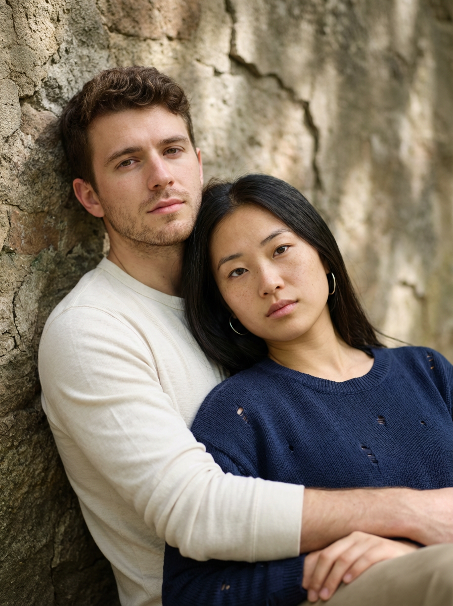 {"composition": {"framing": "vertical portrait", "crop": "waist-up", "camera_angle": "slightly above eye-level", "subject_position": "two subjects closely intertwined, diagonally oriented across frame", "pose": "male subject reclined against stone wall, model subject resting back into his chest with arms folded forward", "visual_balance": "intimate asymmetry with overlapping bodies creating layered depth", "depth_of_field": "shallow, subjects in focus with softly textured background"}, "subjects": [{"type": "human male", "approximate_age": "early to mid 20s", "expression": "calm, introspective", "gaze": "direct to camera", "skin_tone": "fair with cool undertones", "hair": {hair, "style": "short, naturally wavy", "texture": "slightly tousled"}, "facial_features": {"facial_hair": "light stubble", "structure": "soft jawline, gentle cheek contour s"}}, {"type": "human model", "approximate_age": "early 20s", "expression": "neutral, subtly guarded", "gaze": "direct to camera", "skin_tone": "fair with warm undertones", "distinctive_features": "visible freckles across cheeks and nose", "hair": {hair, "style": "long, straight with slight natural wave", "part": "center"}, if(gender=f){"makeup": {"base": "minimal, natural skin texture visible", "eyes": "light mascara} , no heavy liner", "lips": "natural rose tone"}}], "wardrobe_and_accessories": {"male_clothing": {"top": "off-or cream long-sleeve shirt", "style": "casual, soft fabric", "fit": "relaxed"}, "female_clothing": {"top": {"color": "deep navy blue", "material": "knit fabric with distressed holes", "style": "long-sleeve, semi-sheer texture", "fit": "slim"}}, "accessories": {"female_earrings": "small silver if(gender=f){hoop earrings } ", "overall_style": "minimal, understated"}}, "background": {"environment": "outdoor setting", "surface": "weathered stone wall", "texture": "rough, uneven stone with natural cracks", "color_palette": ["muted browns", "gray", "olive tones"], "background_role": "earthy, rustic contrast to soft skin and clothing textures"}, "color_palette": {"primary_colors": ["navy blue", "cream", "stone gray"], "secondary_colors": ["soft brown", "muted green", "natural skin tones"], "overall_tone": "cool-neutral with organic warmth"}, "lighting": {"type": "natural daylight", "direction": "side-lit with dappled sunlight", "quality": "soft with irregular light patches", "shadows": "gentle, organic shadows cast by surrounding foliage", "skin_rendering": "natural, textured, realistic"}, "technical_traits": {"focus": "sharp on faces", "lens_look": "portrait lens aesthetic (approx. 50mm)", "aperture_effect": "background separation without heavy blur", "grain": "slight natural grain", "image_clarity": "moderate to high, editorial softness"}, "artistic_elements": {"mood": "intimate, contemplative, understated", "aesthetic_style": "editorial lifestyle portrait", "era_influence": "modern with timeless, analog feel", "visual_theme": "quiet closeness, emotional intimacy"}, "styling_keywords": ["intimate portrait", "natural light", "editorial couple", "soft realism", "emotional closeness", "organic textures"]}