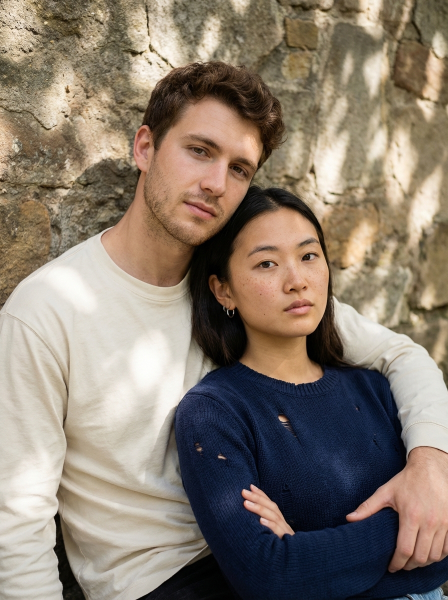{"composition": {"framing": "vertical portrait", "crop": "waist-up", "camera_angle": "slightly above eye-level", "subject_position": "two subjects closely intertwined, diagonally oriented across frame", "pose": "male subject reclined against stone wall, model subject resting back into his chest with arms folded forward", "visual_balance": "intimate asymmetry with overlapping bodies creating layered depth", "depth_of_field": "shallow, subjects in focus with softly textured background"}, "subjects": [{"type": "human male", "approximate_age": "early to mid 20s", "expression": "calm, introspective", "gaze": "direct to camera", "skin_tone": "fair with cool undertones", "hair": {hair, "style": "short, naturally wavy", "texture": "slightly tousled"}, "facial_features": {"facial_hair": "light stubble", "structure": "soft jawline, gentle cheek contour s"}}, {"type": "human model", "approximate_age": "early 20s", "expression": "neutral, subtly guarded", "gaze": "direct to camera", "skin_tone": "fair with warm undertones", "distinctive_features": "visible freckles across cheeks and nose", "hair": {hair, "style": "long, straight with slight natural wave", "part": "center"}, if(gender=f){"makeup": {"base": "minimal, natural skin texture visible", "eyes": "light mascara} , no heavy liner", "lips": "natural rose tone"}}], "wardrobe_and_accessories": {"male_clothing": {"top": "off-or cream long-sleeve shirt", "style": "casual, soft fabric", "fit": "relaxed"}, "female_clothing": {"top": {"color": "deep navy blue", "material": "knit fabric with distressed holes", "style": "long-sleeve, semi-sheer texture", "fit": "slim"}}, "accessories": {"female_earrings": "small silver if(gender=f){hoop earrings } ", "overall_style": "minimal, understated"}}, "background": {"environment": "outdoor setting", "surface": "weathered stone wall", "texture": "rough, uneven stone with natural cracks", "color_palette": ["muted browns", "gray", "olive tones"], "background_role": "earthy, rustic contrast to soft skin and clothing textures"}, "color_palette": {"primary_colors": ["navy blue", "cream", "stone gray"], "secondary_colors": ["soft brown", "muted green", "natural skin tones"], "overall_tone": "cool-neutral with organic warmth"}, "lighting": {"type": "natural daylight", "direction": "side-lit with dappled sunlight", "quality": "soft with irregular light patches", "shadows": "gentle, organic shadows cast by surrounding foliage", "skin_rendering": "natural, textured, realistic"}, "technical_traits": {"focus": "sharp on faces", "lens_look": "portrait lens aesthetic (approx. 50mm)", "aperture_effect": "background separation without heavy blur", "grain": "slight natural grain", "image_clarity": "moderate to high, editorial softness"}, "artistic_elements": {"mood": "intimate, contemplative, understated", "aesthetic_style": "editorial lifestyle portrait", "era_influence": "modern with timeless, analog feel", "visual_theme": "quiet closeness, emotional intimacy"}, "styling_keywords": ["intimate portrait", "natural light", "editorial couple", "soft realism", "emotional closeness", "organic textures"]}