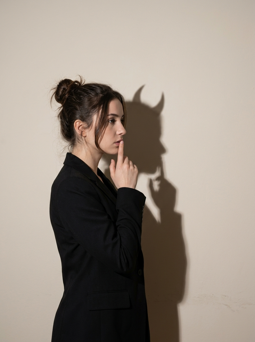 {"composition":{"framing":"vertical portrait, mid- crop","subject_position":"subject placed slightly left of center, facing right in three-quarter profile","negative_space":"large empty wall space on right used to project shadow","visual_concept":"contrast between subject and symbolic shadow creating duality"},"subject":{"gender_presentation":"female-presenting","age_range":"young adult","pose":"right hand raised with index finger touching lips, contemplative stance","facial_expression":"pensive, introspective, slightly tense","gaze_direction":"looking off-frame to the right"},"hair":{"color":"dark brown","style":"messy bun with loose strands framing face","texture":"natural, slightly tousled"},"clothing":{"type":"tailored blazer","color":"matte black","style":"minimalist, formal, modern","fit":"structured shoulders, fitted silhouette","details":" no accessories"},"lighting":{"light_source":"single hard light positioned front-left of subject","quality":"hard, directional","shadow_behavior":"sharp, high-contrast shadow cast onto wall","mood_effect":"dramatic, psychological, symbolic"},"shadow":{"shape":"human silhouette with exaggerated devil horns","clarity":"well-defined edges","symbolism":"inner conflict, hidden nature, dual personality"},"color_palette":{"dominant_colors":["black","warm beige","soft brown"],"saturation":"low","contrast":"high between subject and background"},"background":{"type":"plain interior wall","texture":"subtle painted wall grain","color":"off-white \/ light beige","environment":"studio or controlled indoor space"},"camera_characteristics":{"lens_look":"standard to short telephoto perspective","depth_of_field":"moderate, subject and shadow in focus","distortion":"minimal","angle":"eye-level"},"artistic_style":{"genre":"conceptual portrait photography","aesthetic":"moody, minimalist, psychological","influences":"symbolism, chiaroscuro lighting","narrative":"visual metaphor of hidden thoughts or darker inner self"},"post_processing":{"skin_tone":"natural, softly smoothed","color_grading":"neutral with slight warmth","sharpening":"moderate on facial features","noise":"minimal"},"overall_tone":{"emotion":"introspective, tense, mysterious","visual_message":"contrast between outward composure and inner complexity"}}