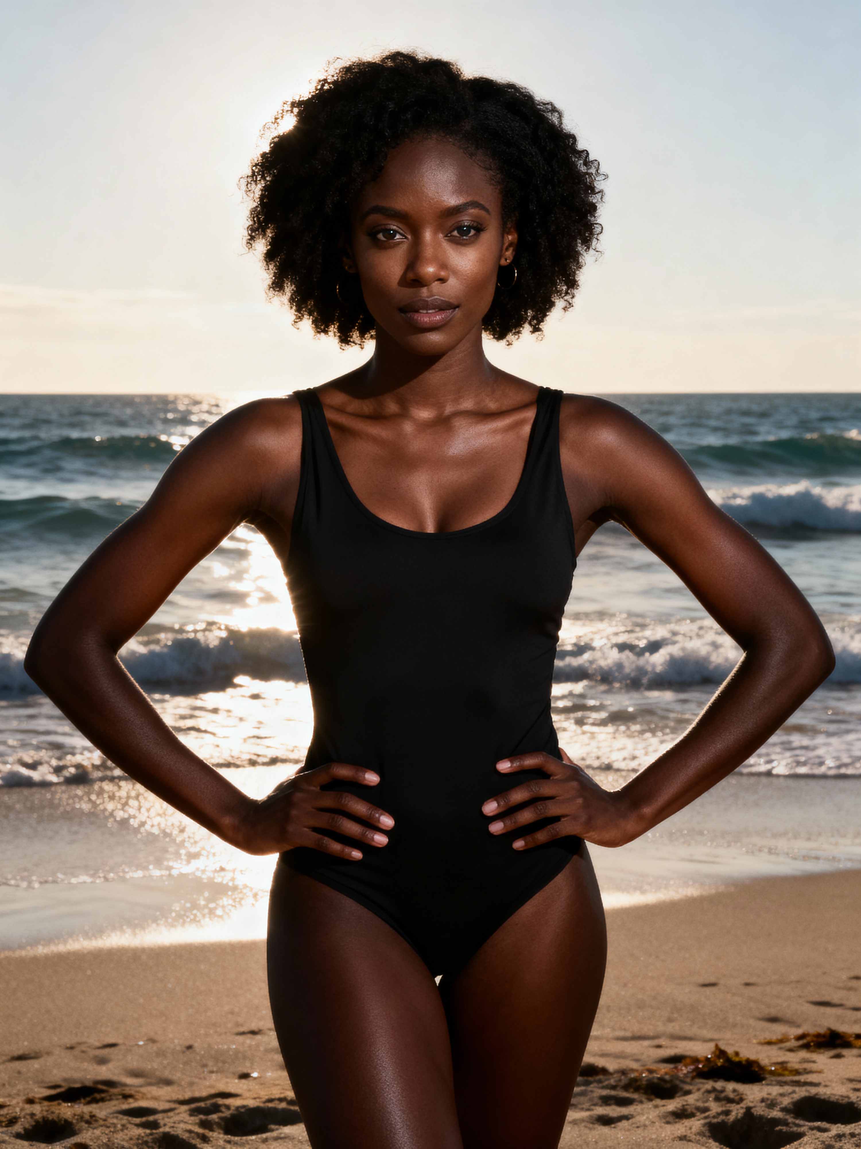 confident feminine model posing at the beach with the ocean as a backdrop