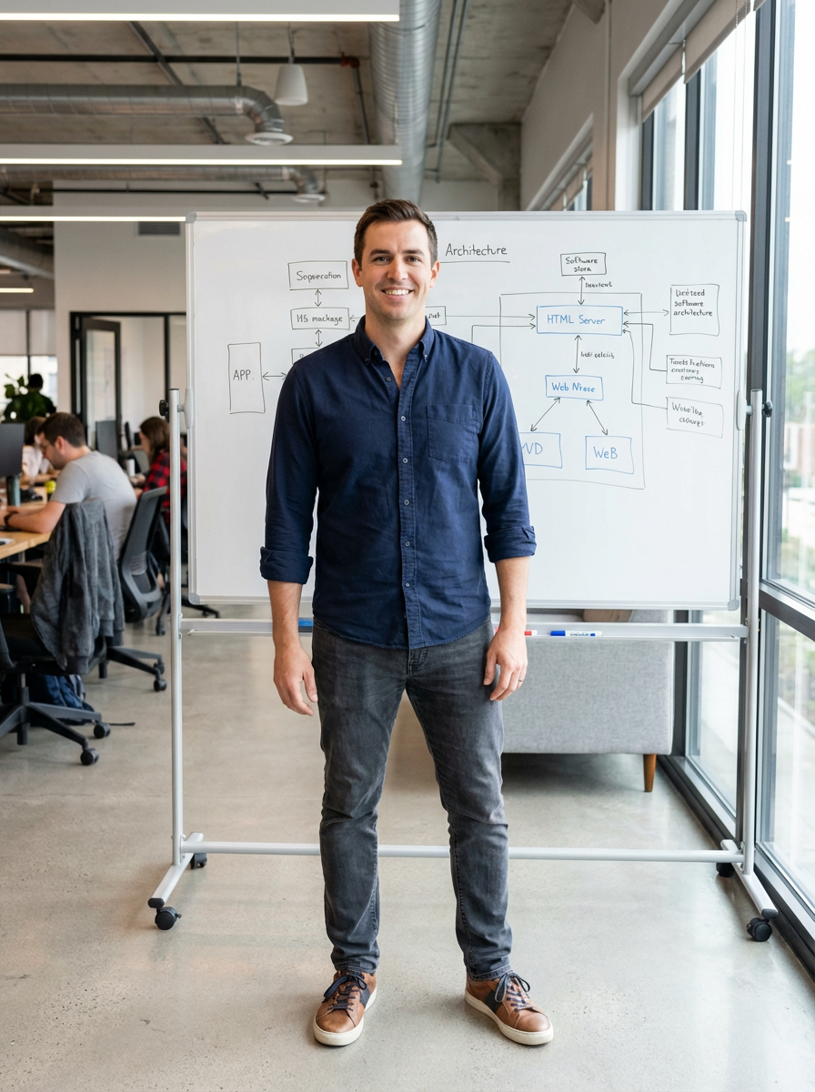 confident model wearing casual tech attire with button-up shirt and jeans standing in front of a whiteboard with diagrams, modern co-working space, natural lighting