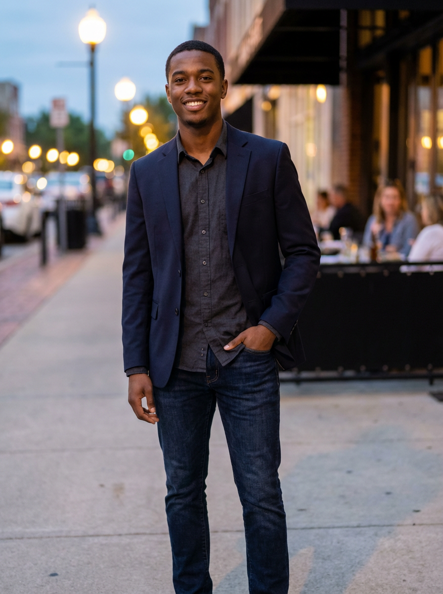 confident masculine model dressed in smart-casual attire, ready for a dinner date