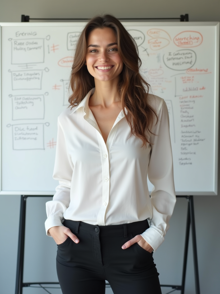 confident model wearing smart casual blouse and tailored pants standing in front of a whiteboard with diagrams, modern co-working space, natural lighting