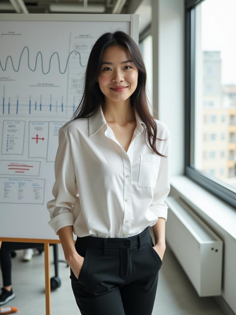 confident model wearing smart casual blouse and tailored pants standing in front of a whiteboard with diagrams, modern co-working space, natural lighting