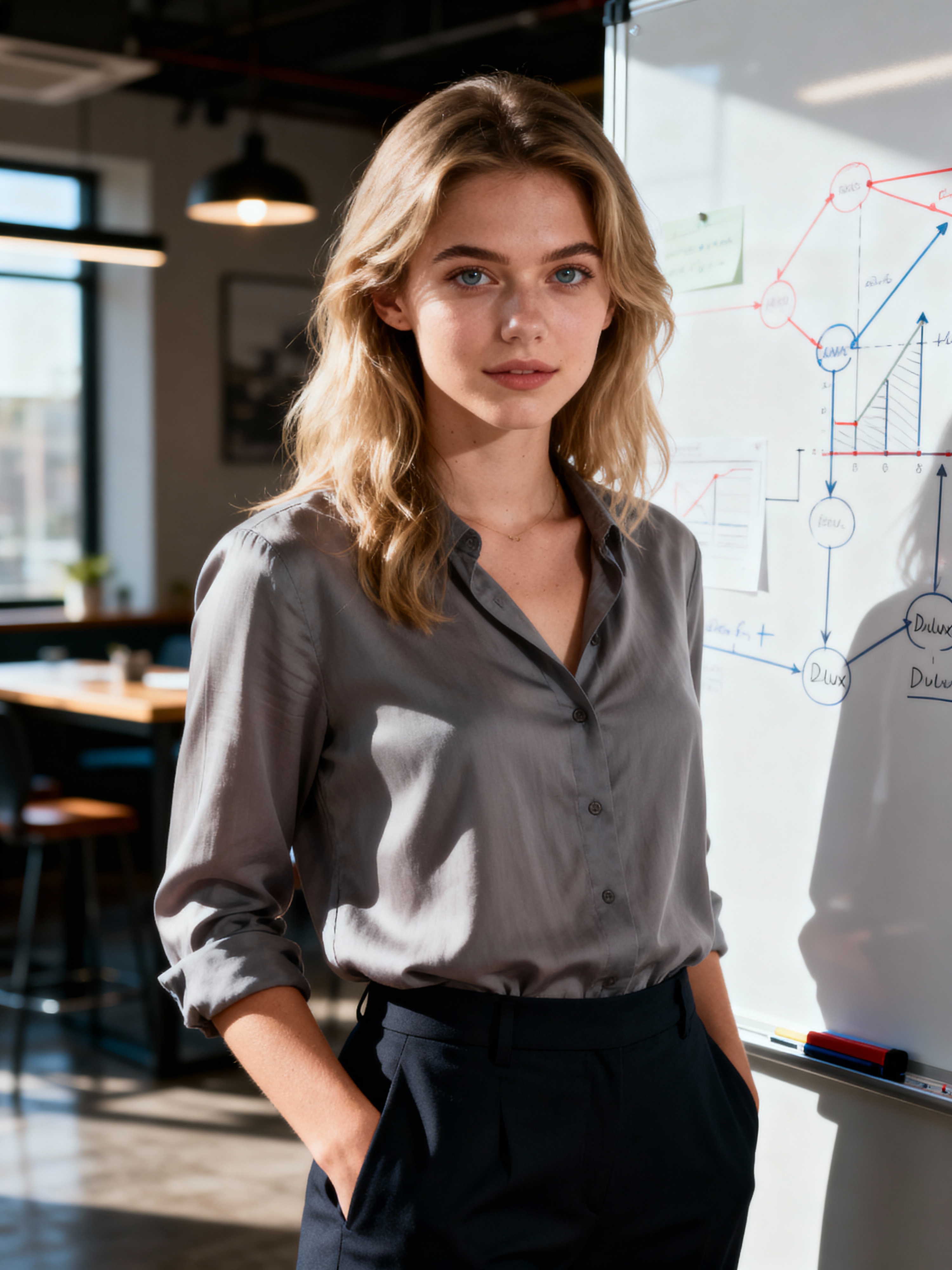 confident model wearing smart casual blouse and tailored pants standing in front of a whiteboard with diagrams, modern co-working space, natural lighting