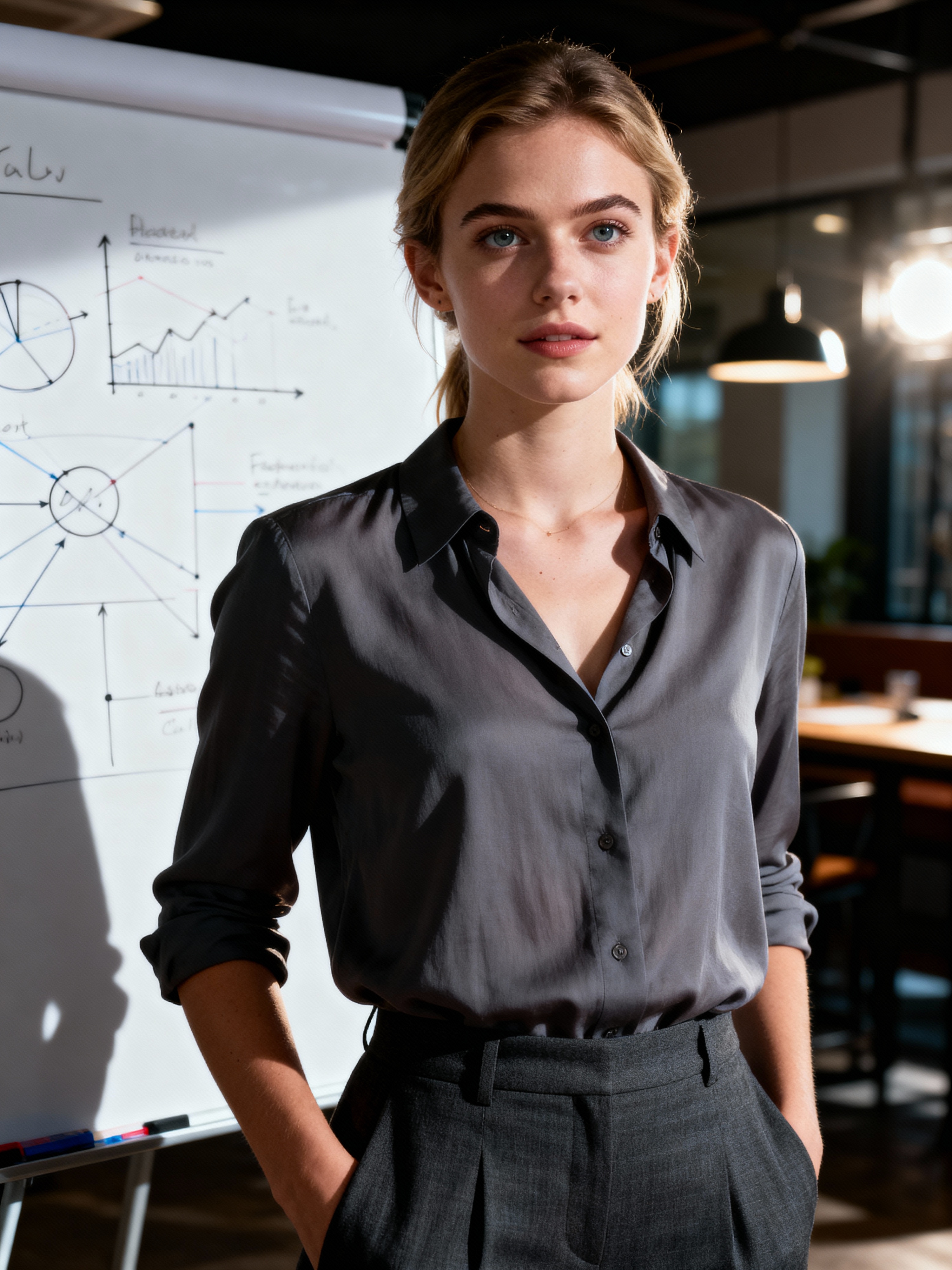 confident model wearing smart casual blouse and tailored pants standing in front of a whiteboard with diagrams, modern co-working space, natural lighting