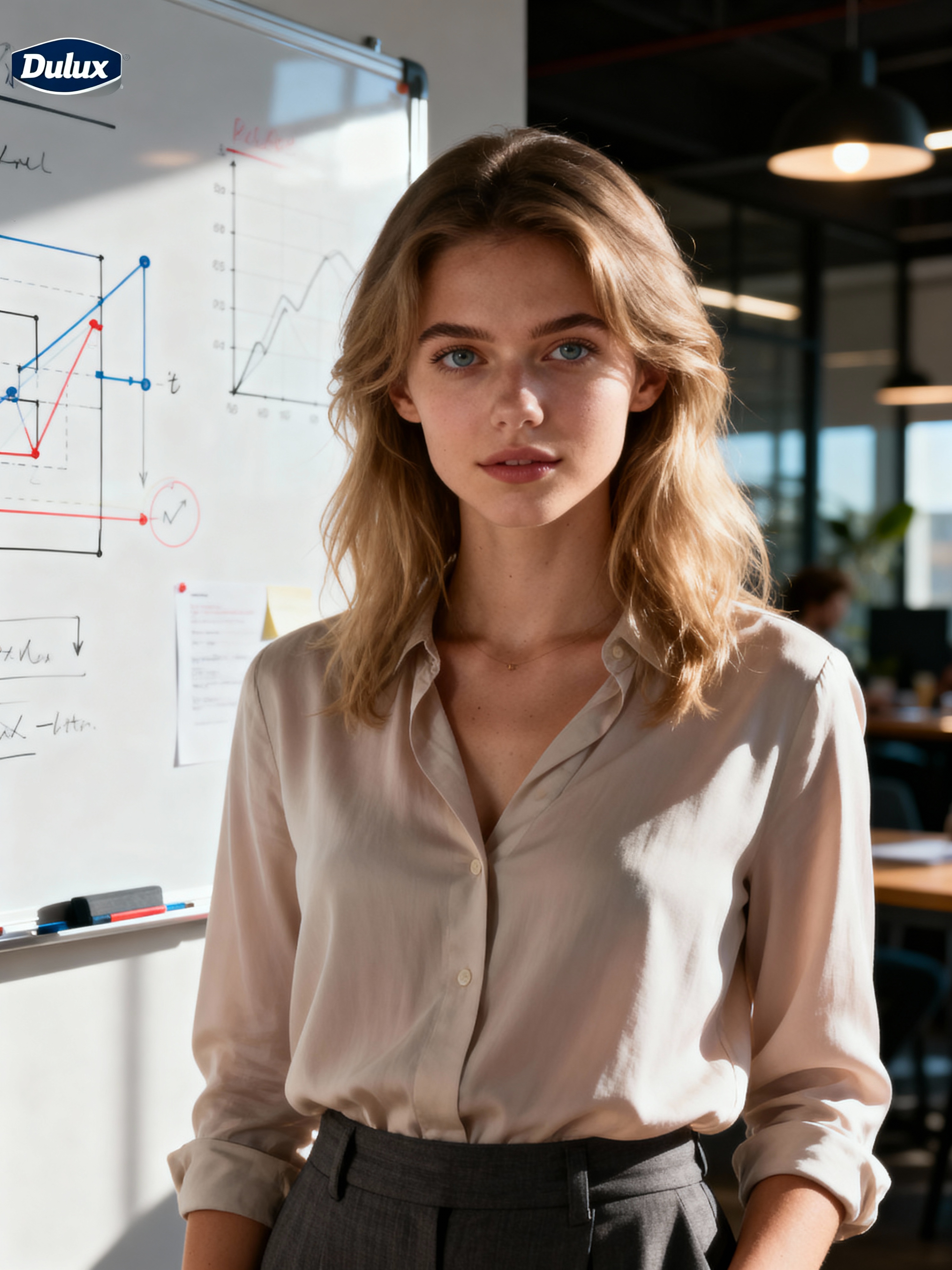 confident model wearing smart casual blouse and tailored pants standing in front of a whiteboard with diagrams, modern co-working space, natural lighting