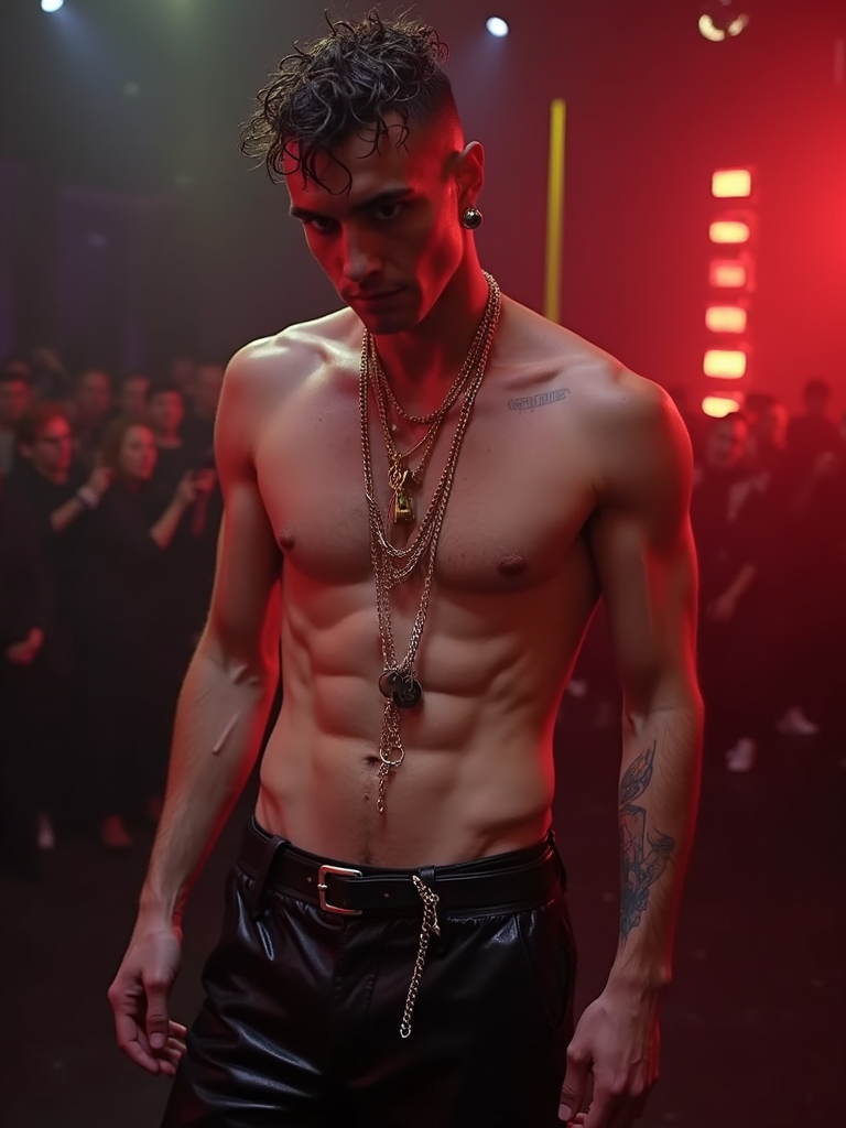 cool model at techno party in berghain night club in berlin. at night. the model is shirtless wearing black leather shorts, wears gold chain. body covered in metal chains.