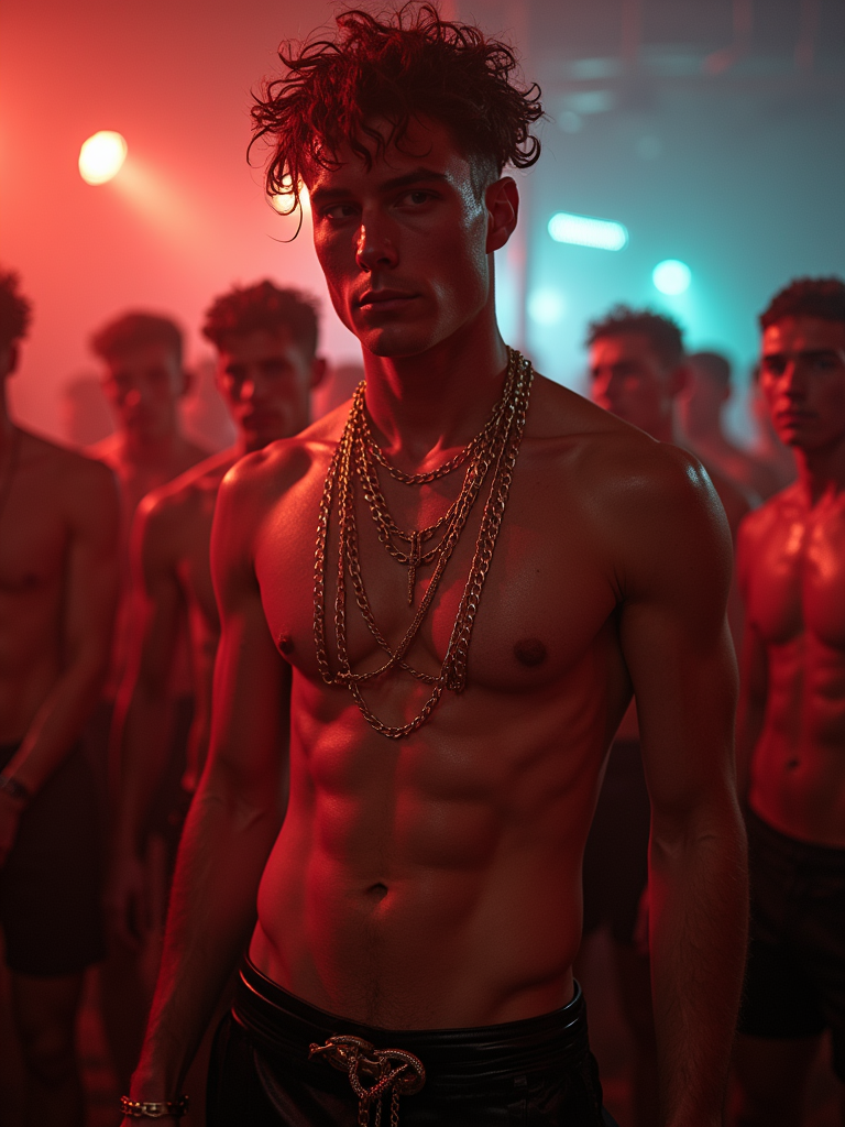 cool model at techno party in berghain night club in berlin. at night. the model is shirtless wearing black leather shorts, wears gold chain. body covered in metal chains.