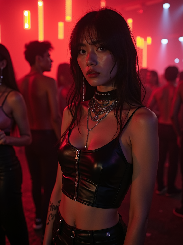 cool model at techno party in berghain night club in berlin. at night. the model is shirtless with a black leather crop top and black leather pants, black collar choker . body covered in metal chains.