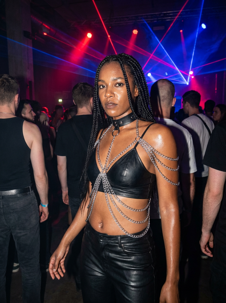 cool model at techno party in berghain night club in berlin. at night. the model is shirtless with a black leather crop top and black leather pants, black collar choker . body covered in metal chains.